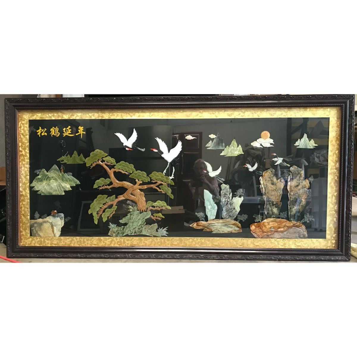 Large Asian landscape scene, three-dimensionalcollage, framedshadowbox, multi-shell creation. Mountain landscape with flying cranes. 7' 3" W X 3' 5" L & 2 1/2" D. * Lightweight molded frame with plexi-glass, still a very heavy & fragile piece that will require special shipping.