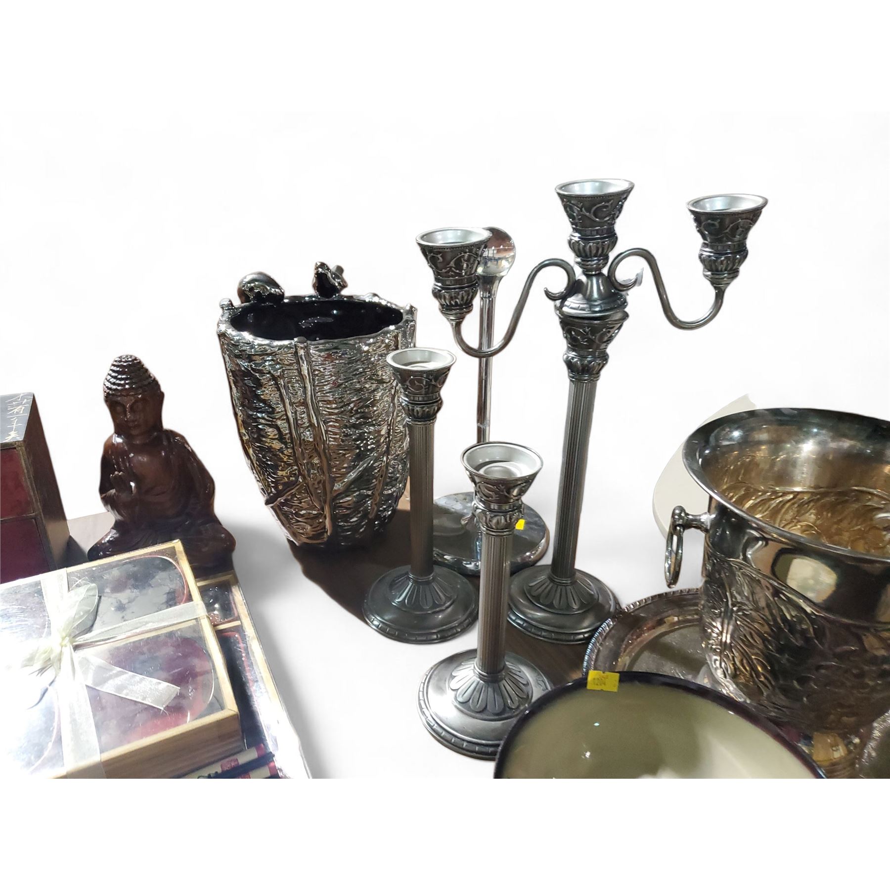 Large Assorted Home Decor & Tableware Items — Silver‑Tone Candlesticks, Asian Carved Buddha Figures, Plates/Bowls, Vases, and More