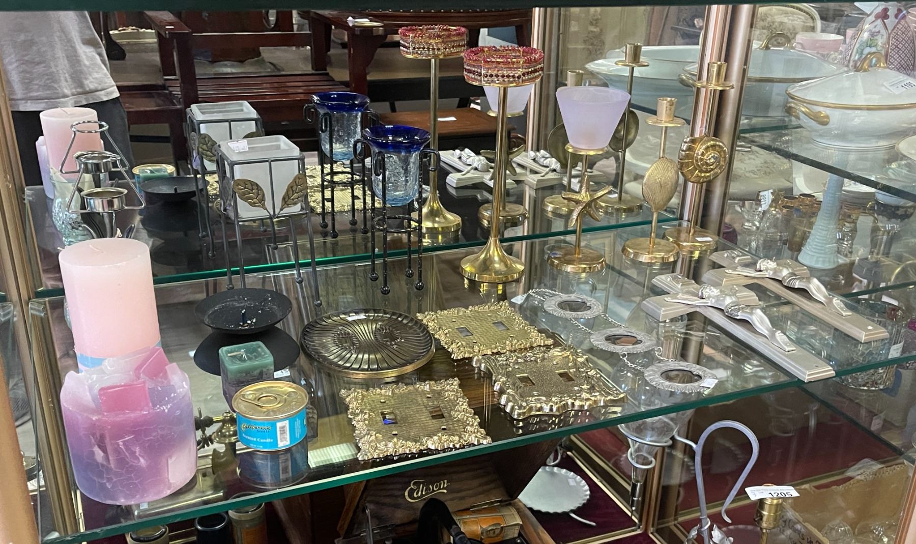 Large Assortment Of Collectibles, Candles, Switch Blades, Crosses, Candle Holders, Etc..