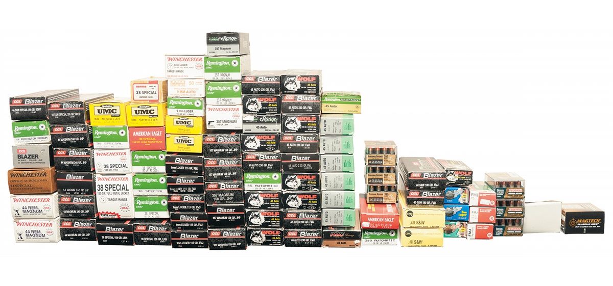 Contains 90 boxes, assorted manufacturers and configurations; six 380 ACP, twelve 38 Special, nineteen 9mm Parabellum, four 40 S&W, three 44 Special, nine 44 Magnum, and twenty-seven 45 ACP.