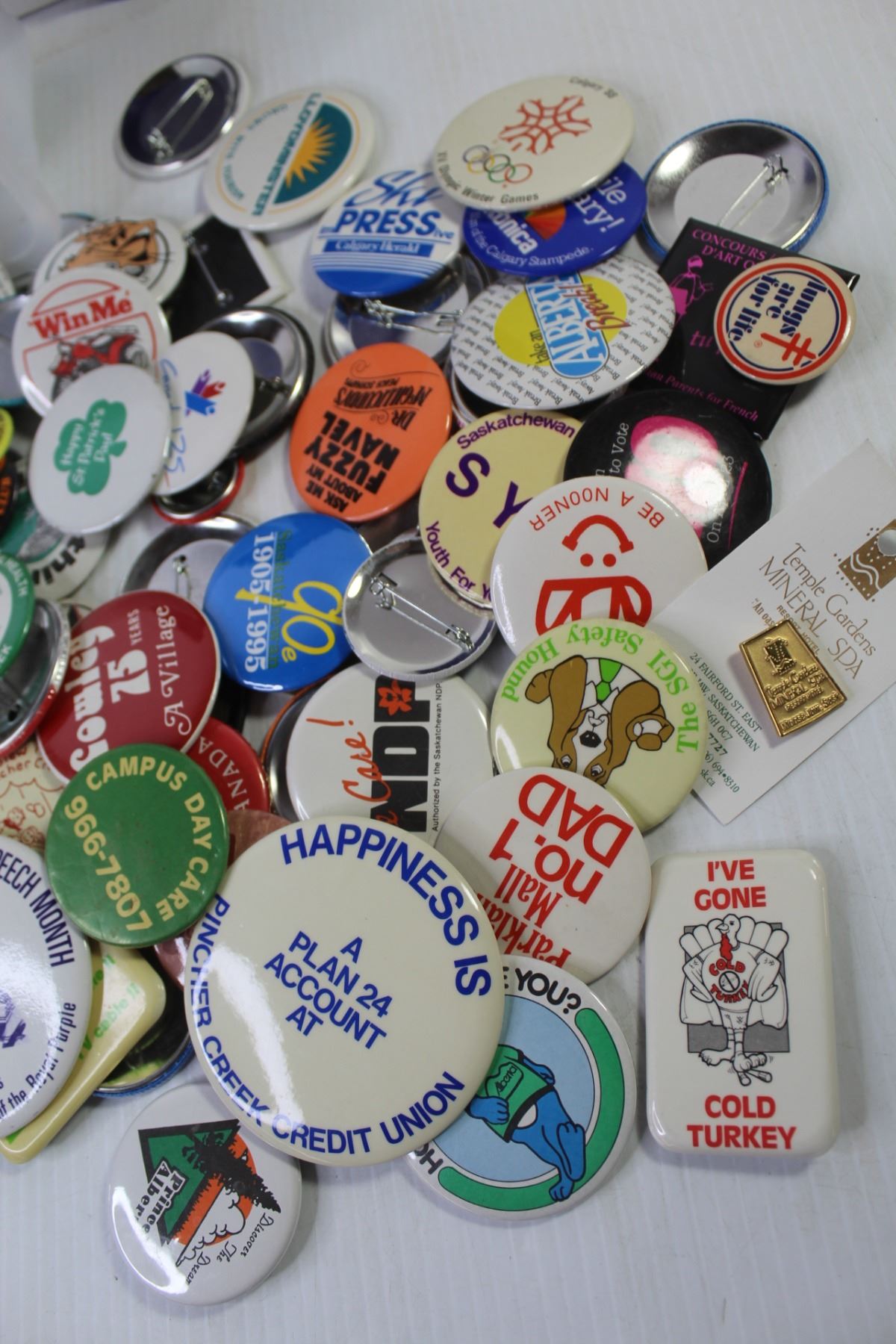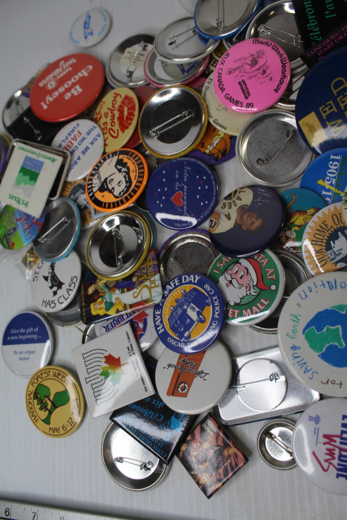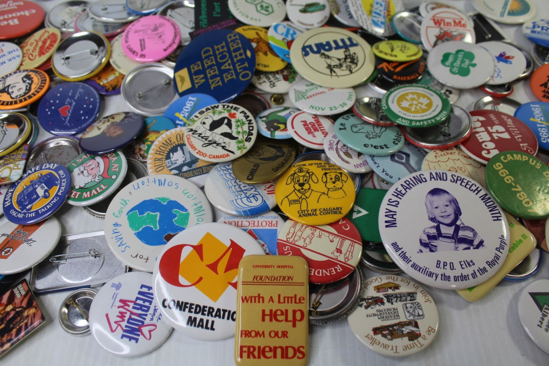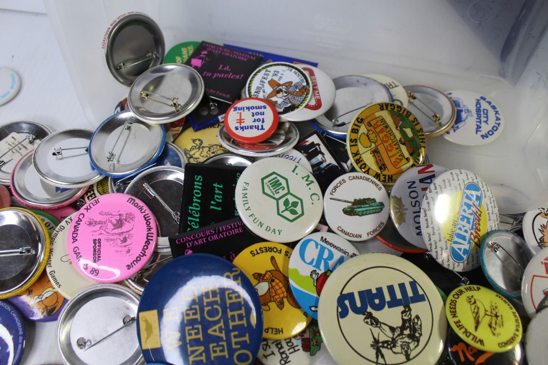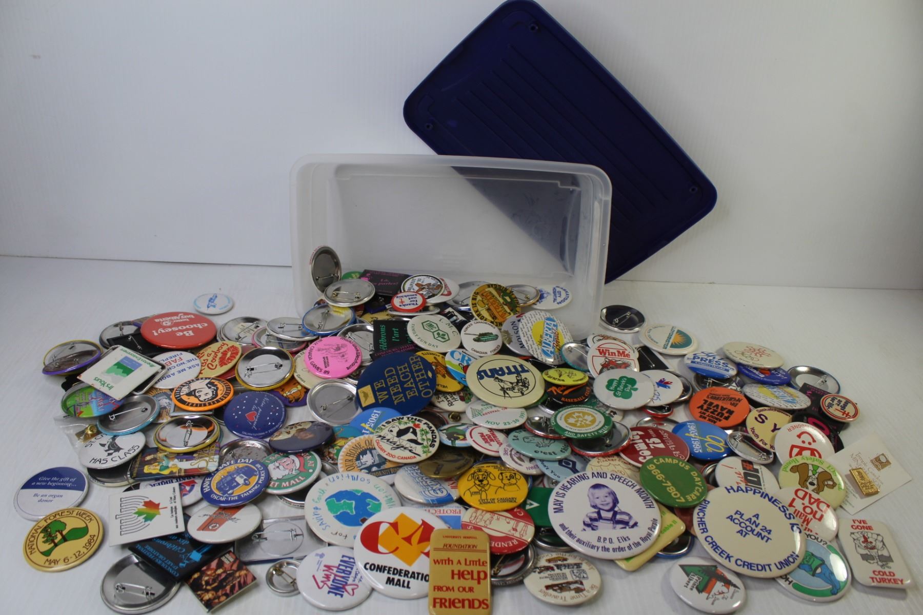 Large Assortment of Button Pins in Plastic Container