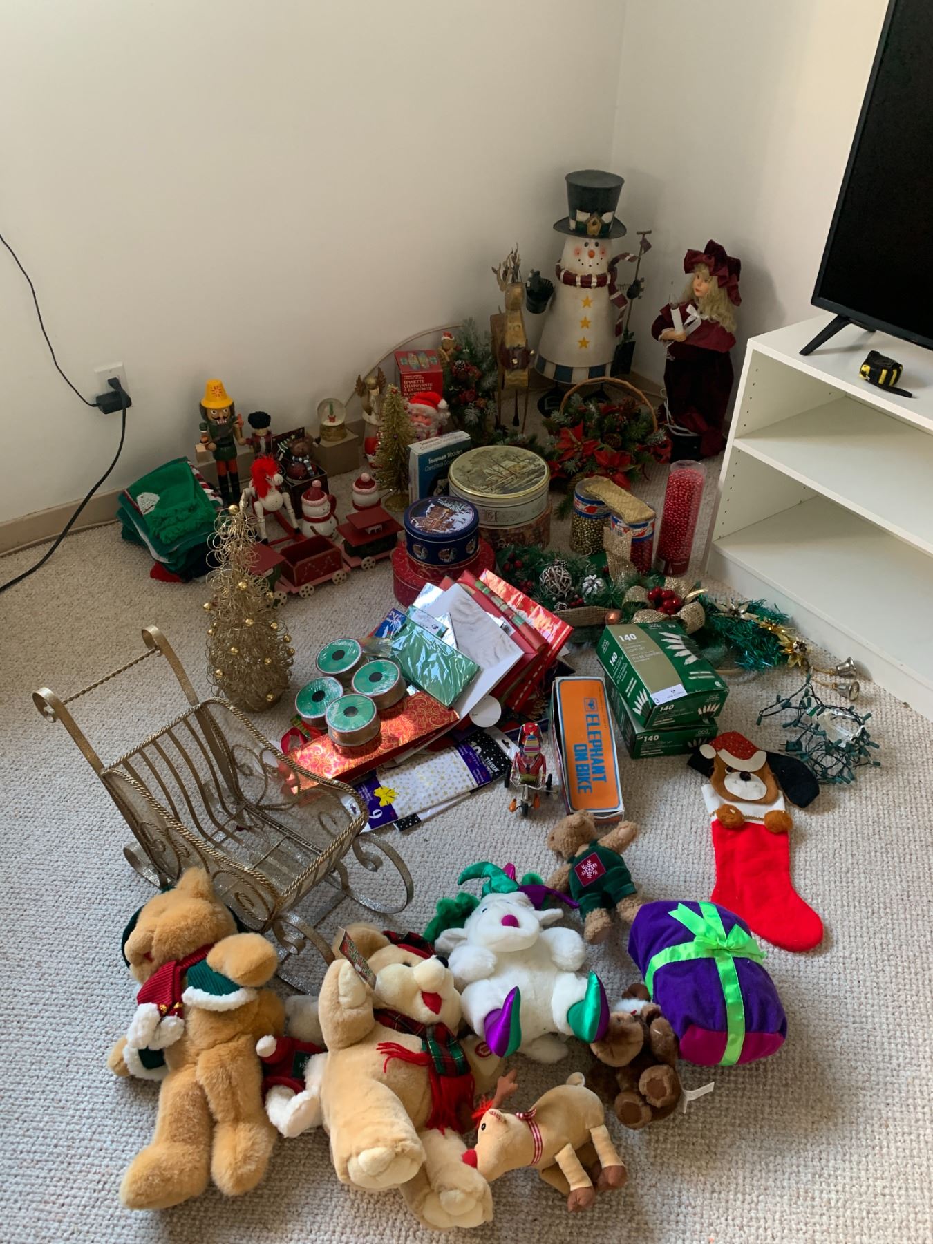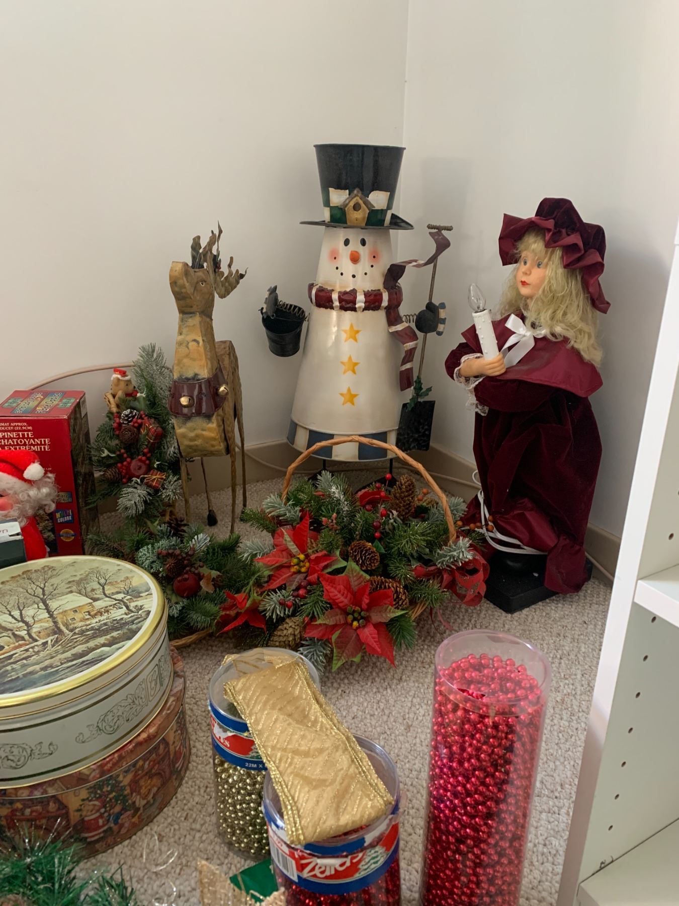 Including lights, plush animals, cookie tins, miniature sleigh, miniature trees, nutcrackers, miniature reindeer, gift supplies, frosty the snowman, and more!