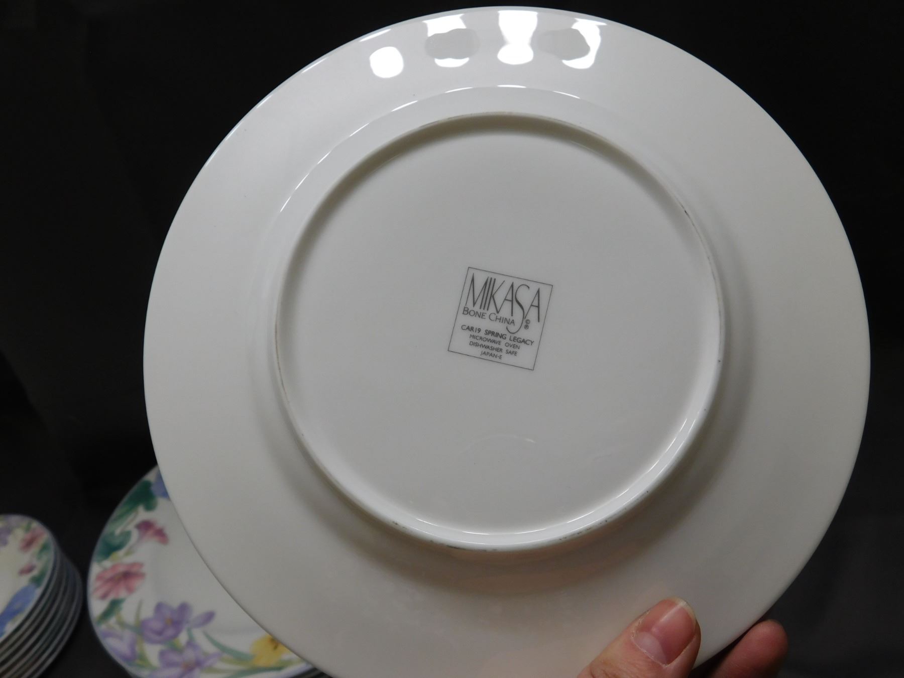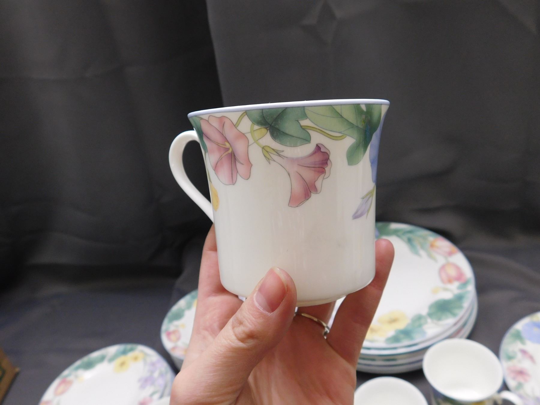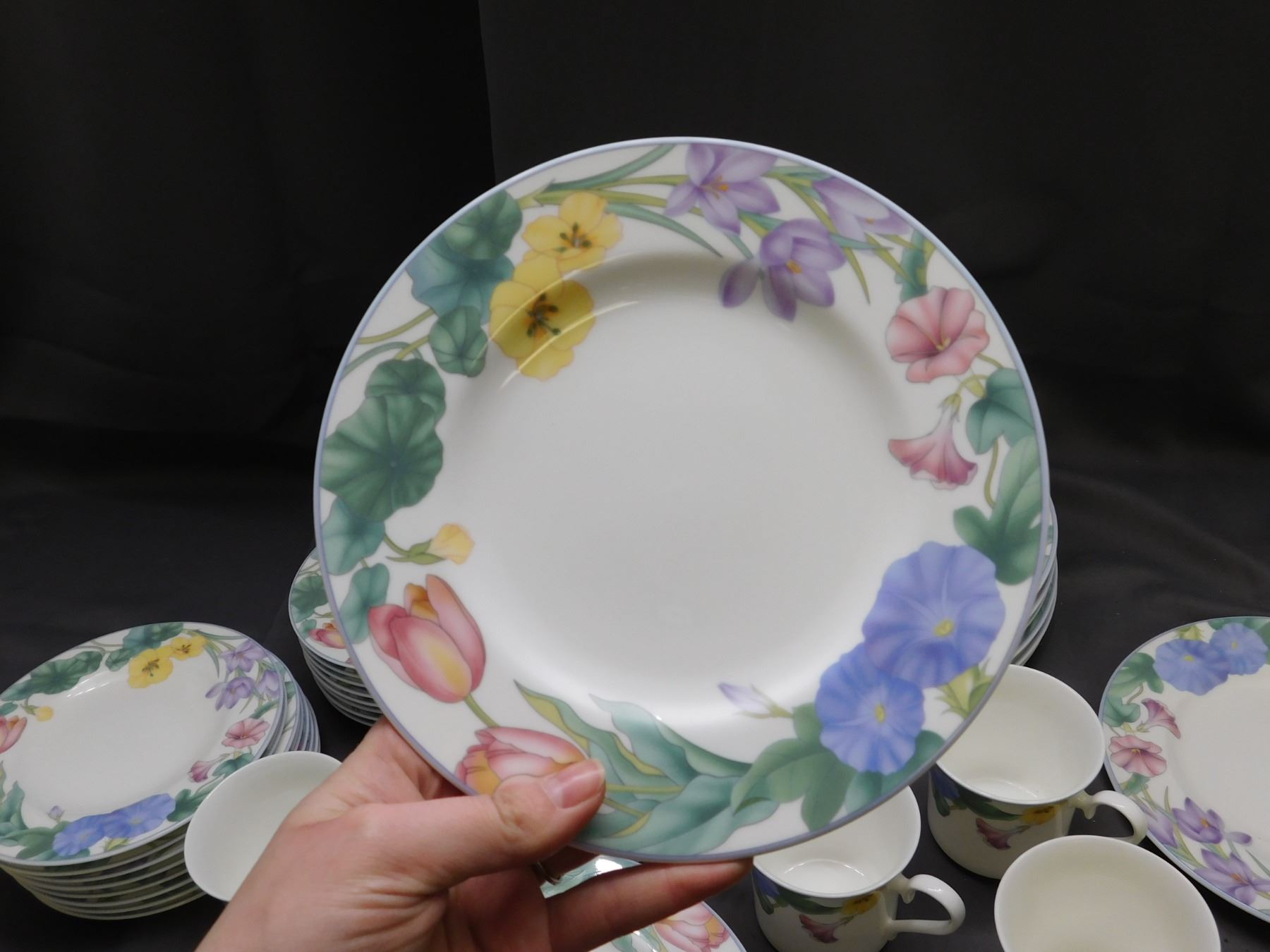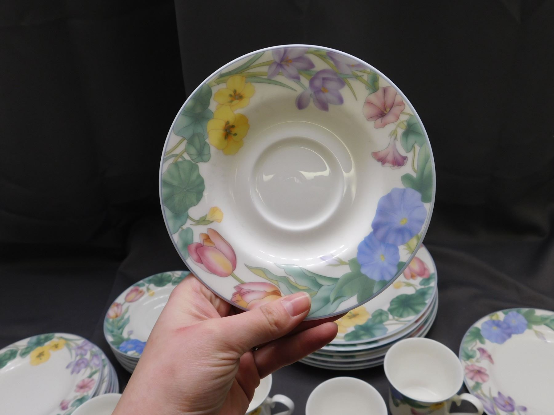 plates qty & size (x8 6"), (x8 7"), (x7 8") & (x6 10"). 8 mugs. 1 extra plate that's also around 8" but slightly larger.