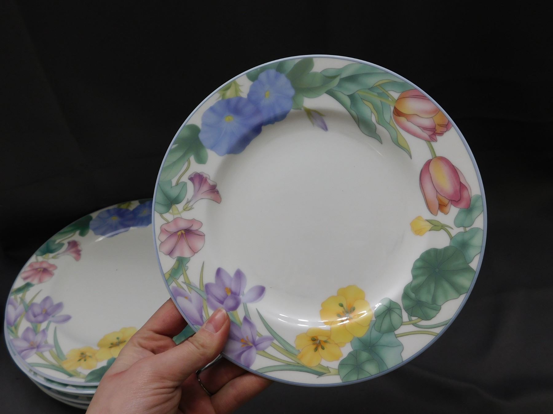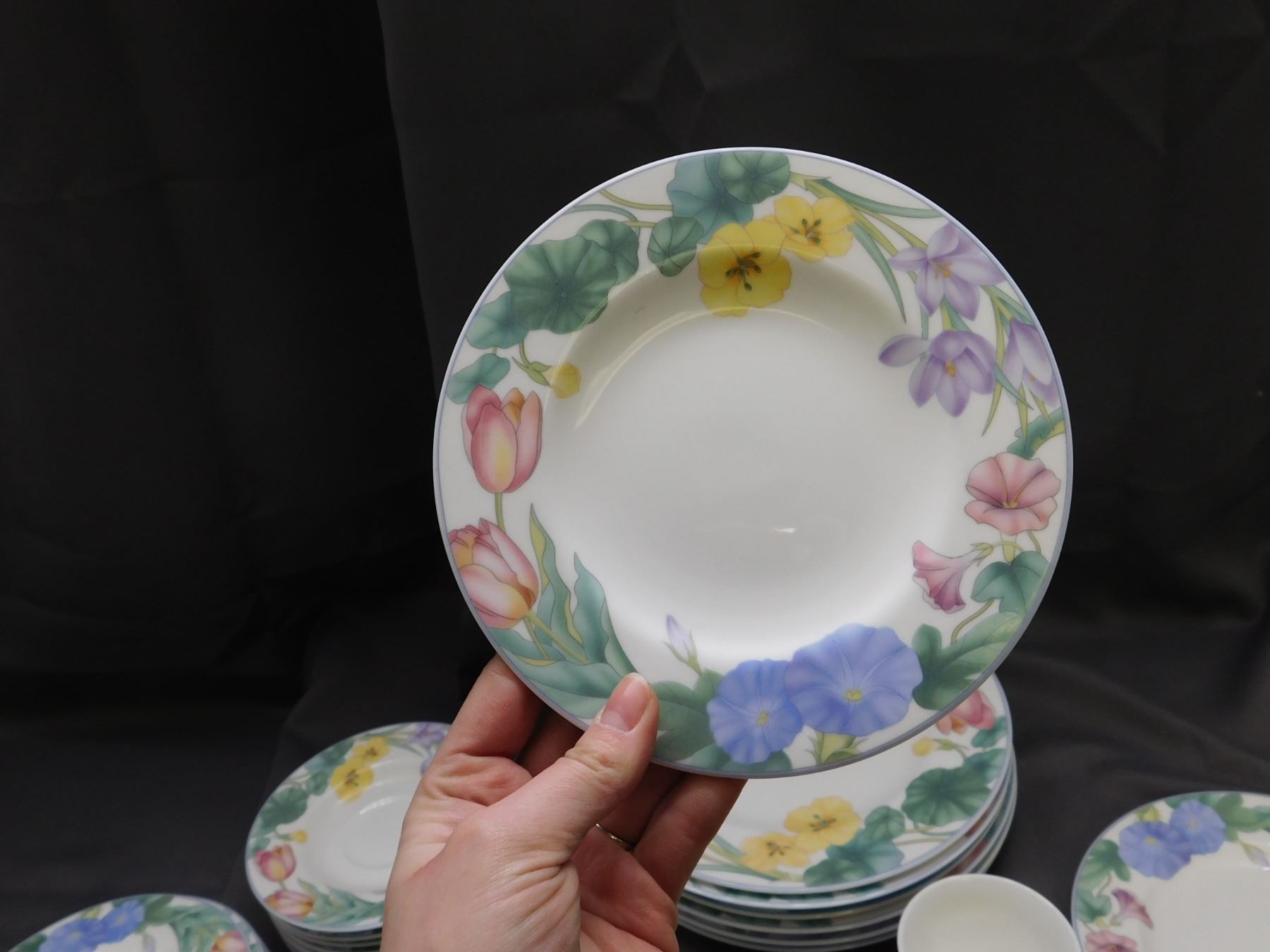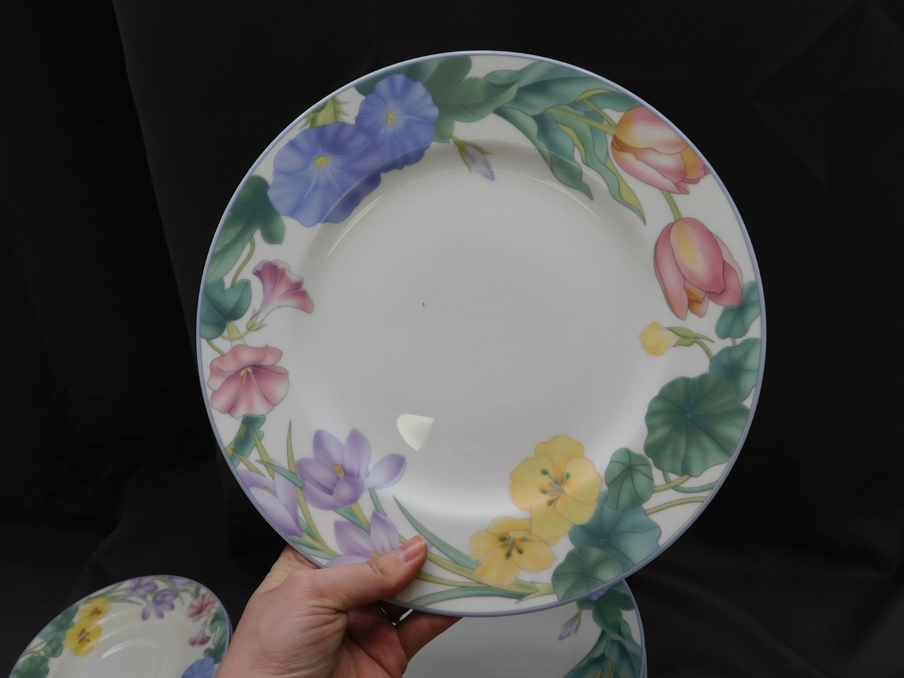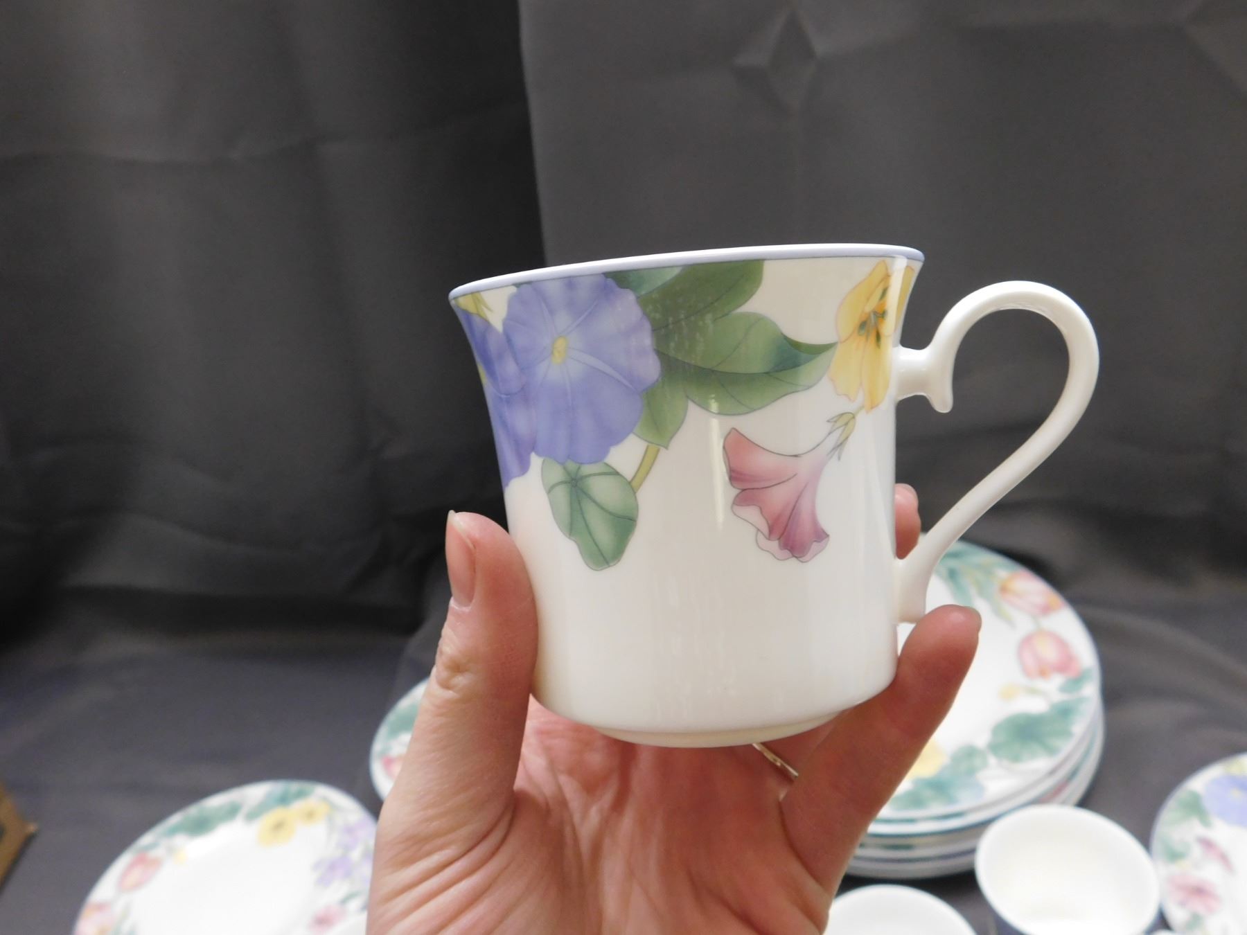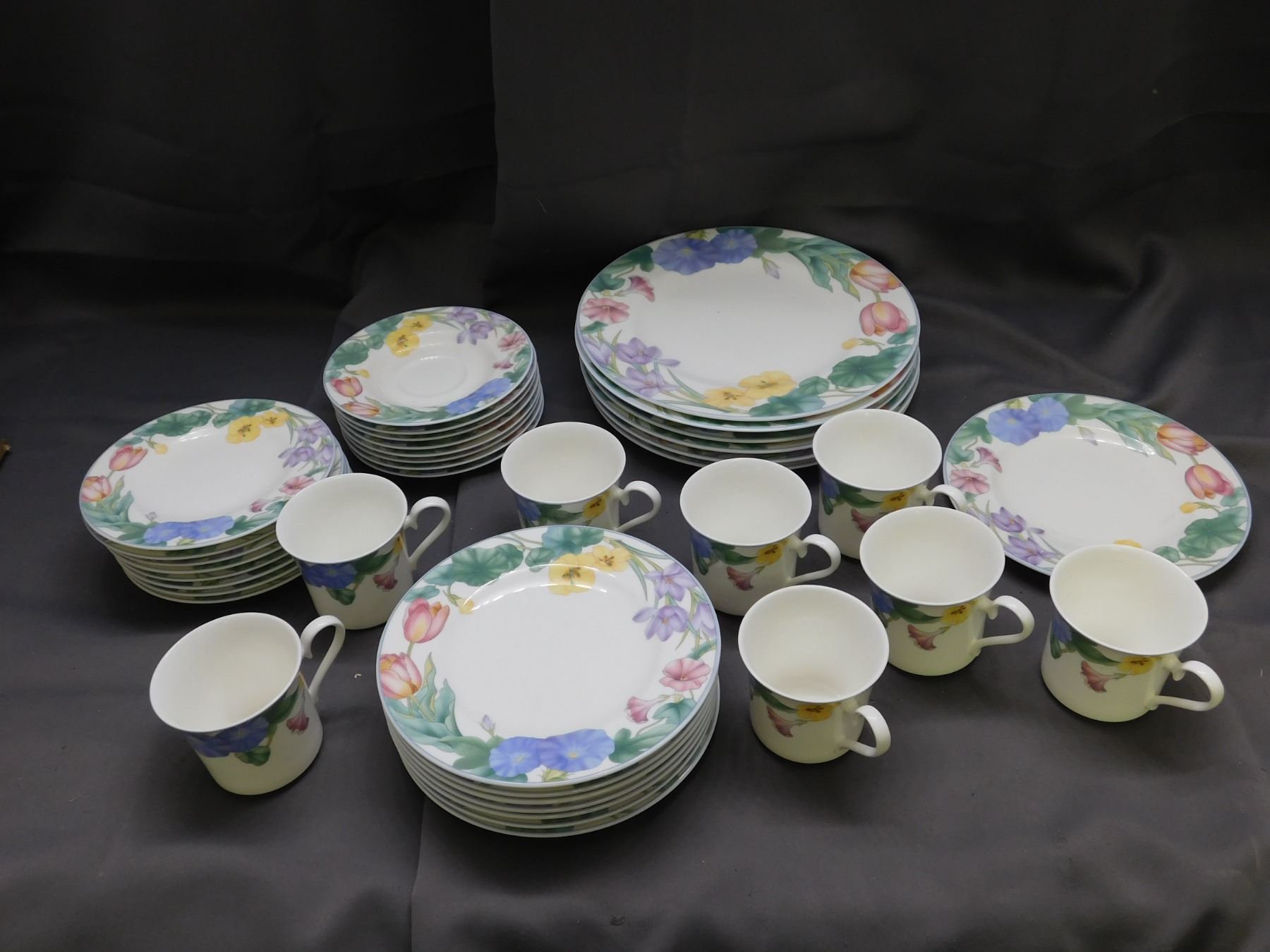 plates qty & size (x8 6"), (x8 7"), (x7 8") & (x6 10"). 8 mugs. 1 extra plate that's also around 8" but slightly larger.