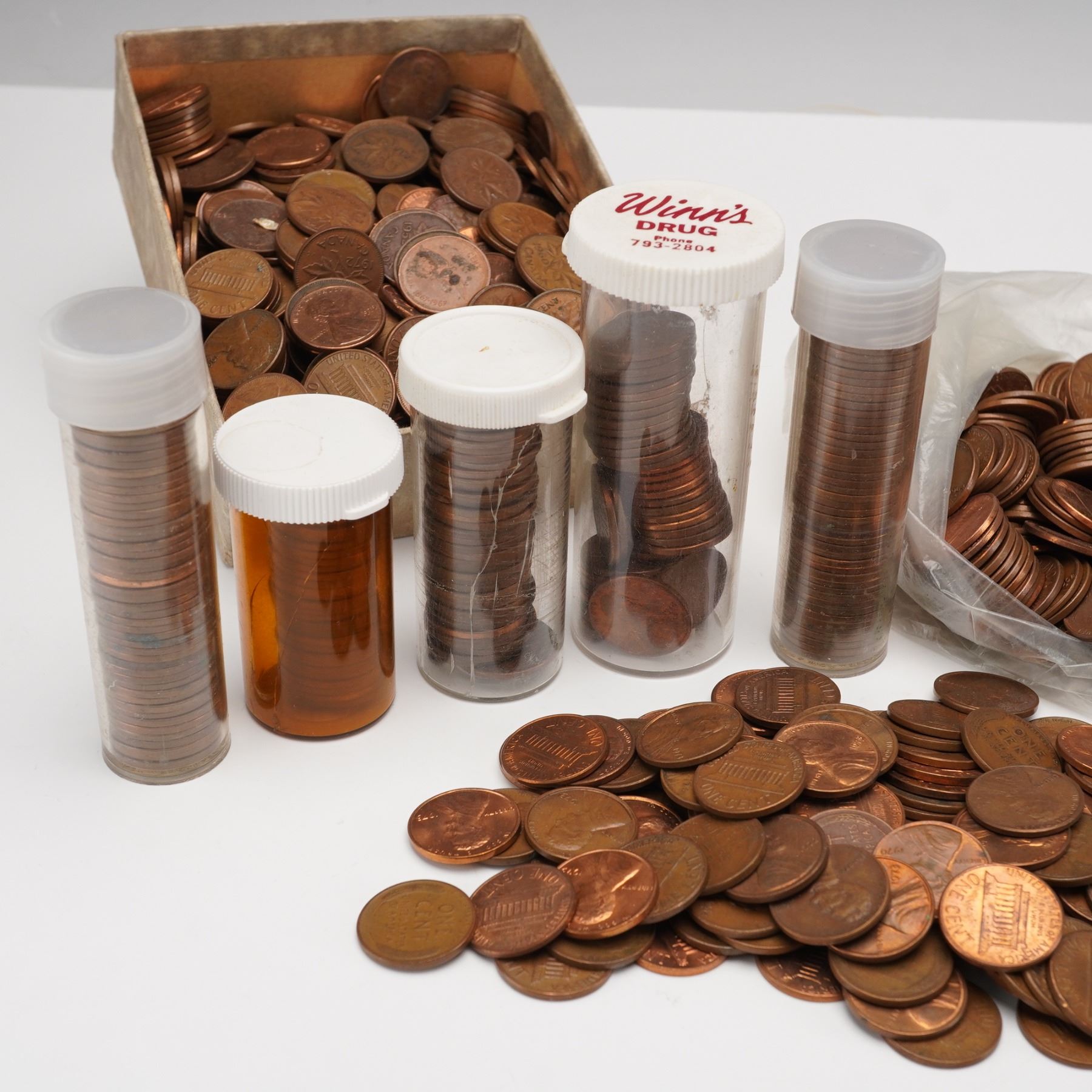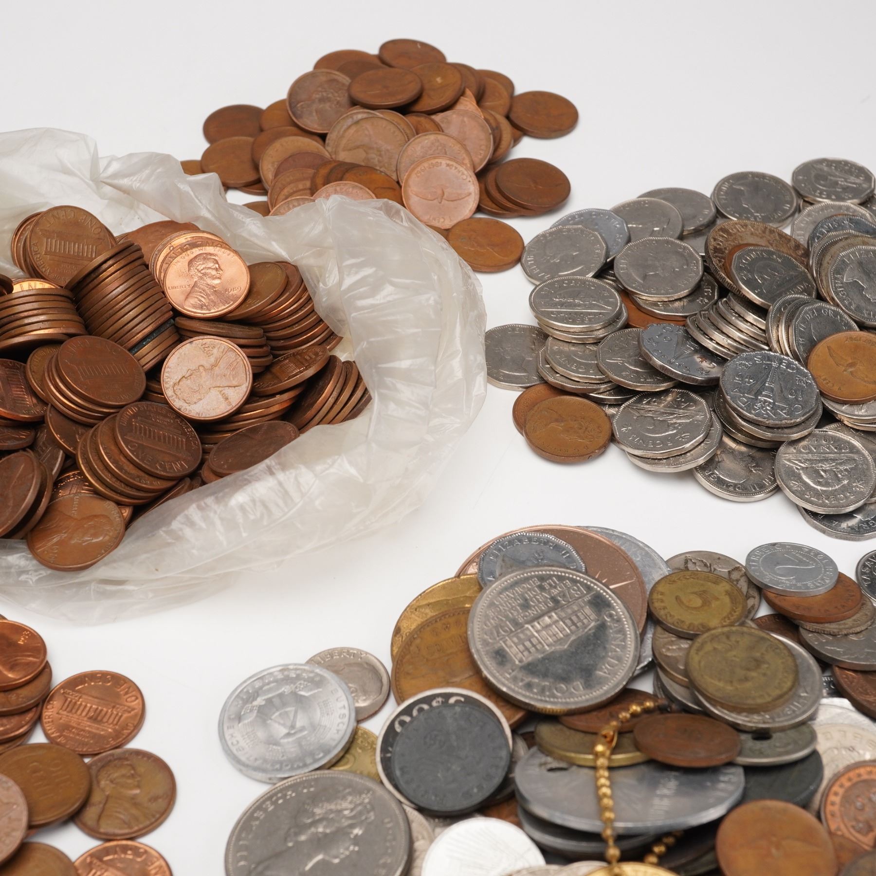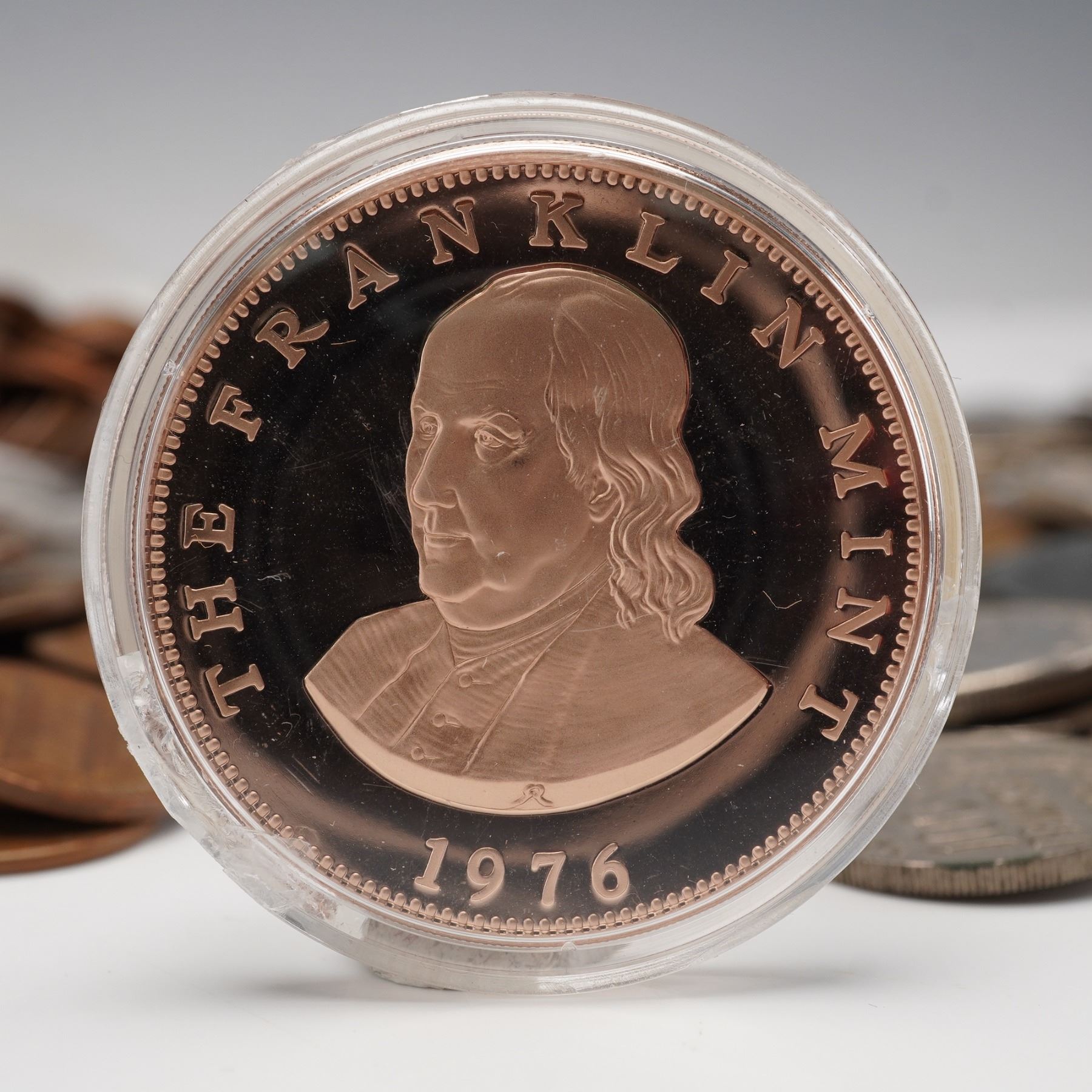 This extensive lot includes a wide variety of United States coins such as Lincoln cents stored in tubes, rolls, and bags, along with mixed circulated nickels, dimes, and quarters. The collection also features numerous world coins from different countries and denominations, showcasing diverse metals and designs. Included is a 1976 Franklin Mint commemorative medal featuring Benjamin Franklin, along with many additional coins not individually listed. This lot provides a broad and varied assortment ideal for collectors and hobbyists alike.