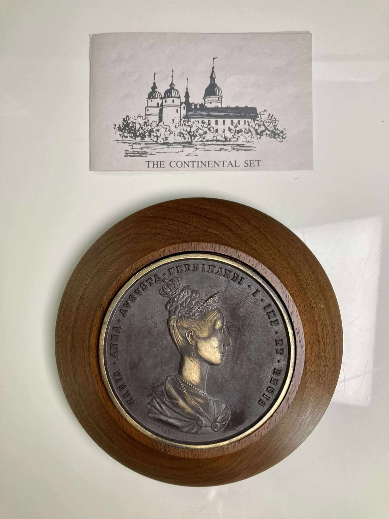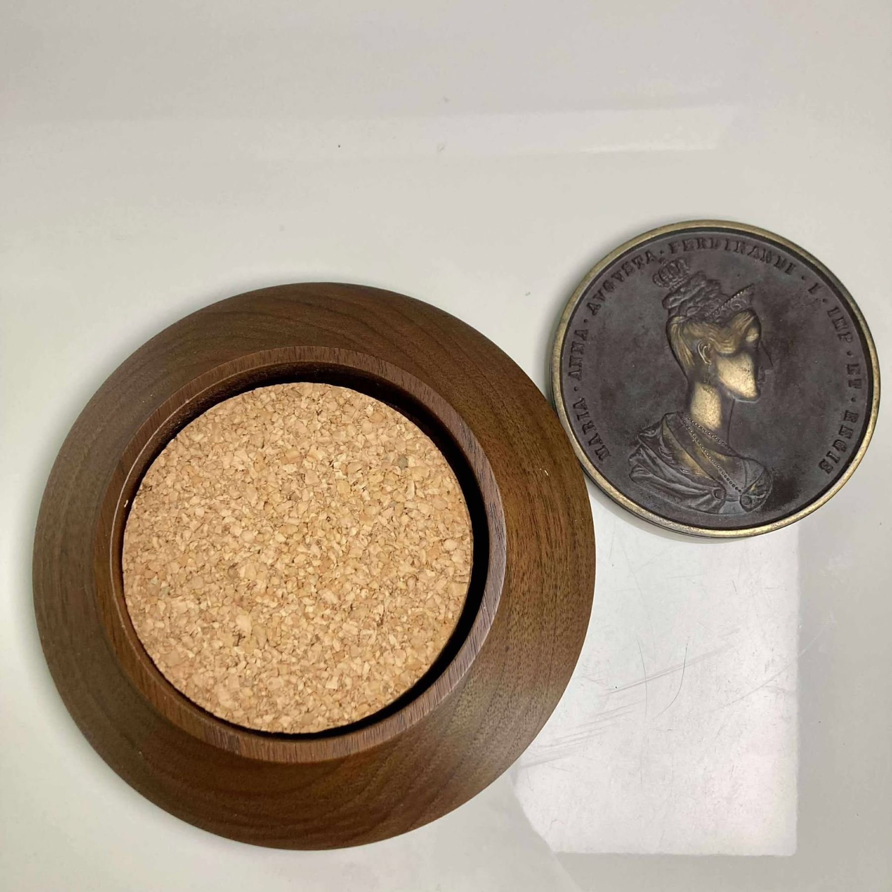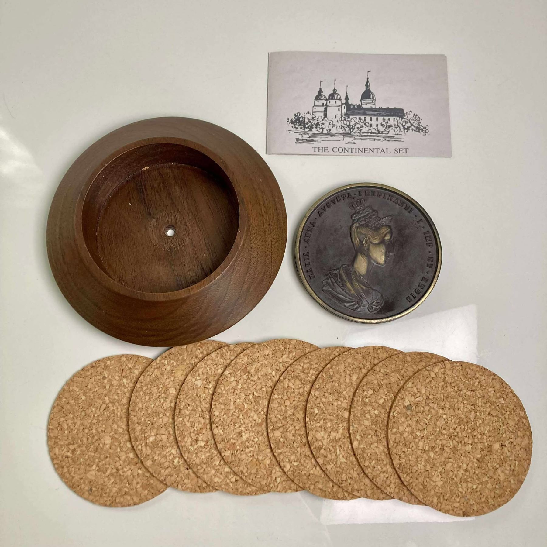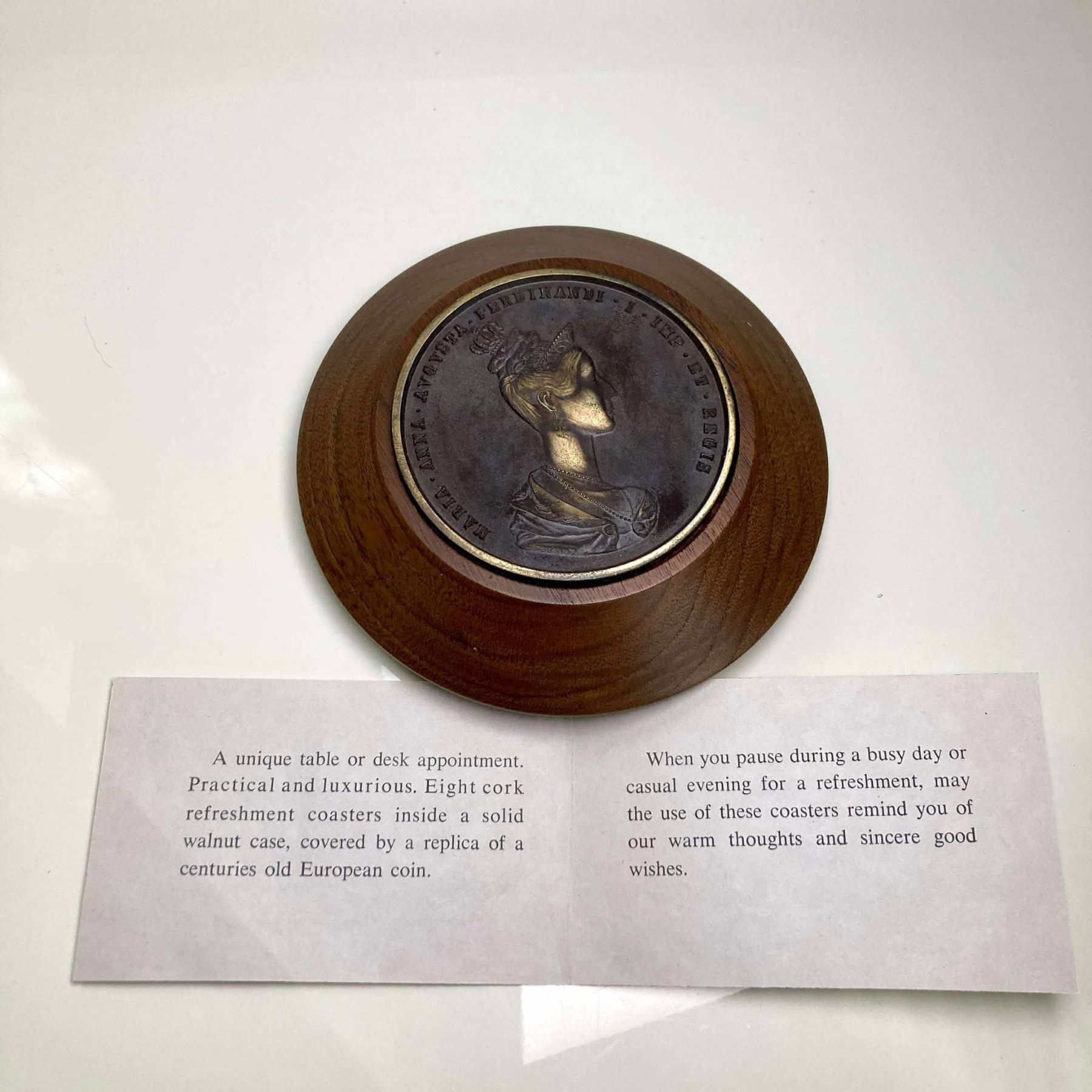 Maria Anna Augusta Ferdinandi coin-like item holds 8 cork coasters. Cushioned bottom metal coin top is approx. 75mm across. Solid walnut wood base/case. In original box. Nice quality.