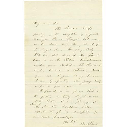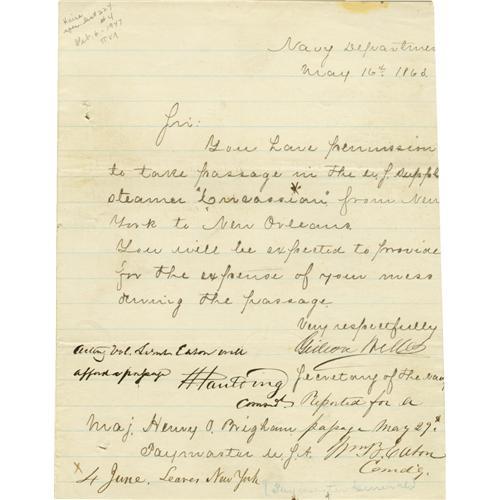 <B>Lincoln Cabinet and Others.</B></I> Interesting collection of letters, signatures, and checks. Comprises: <B>(1) Hannibal Hamlin.</B></I> ALS: "<I>H. Hamlin</B></I>", 1.5 pages, 4.75" x 8", front and verso. Boston, February 6, 1866. To Gov. George S. Boutwell re: the American Cotton Planting and Loan Co. <B>(2) Montgomery Blair.</B></I> Rare ALS: "<I>M. Blair</B></I>", one page, 5" x 8". No place, no date, but as Lincoln's Postmaster General, writing that the President wishes furniture seized from a man to be released to his daughter, Miss Waring. <B>(3) Montgomery Blair.</B></I> Signature: "<I>M. Blair</B></I>" as Postmaster General, 3.5" x 1.5", mounted on sheet. <B>(4) Edward Bates.</B></I> Signature: "<I>Edwd Bates</B></I>", 2.5" x 1", light stains, mounted on sheet. <B>(5) Edwin M. Stanton.</B></I> Manuscript LS: "<I>Edwin M Stanton</B></I>" as Secretary of War, one page, 7.75" x 9.75". To Richard Lathers who has invited the Stantons to visit him in New York. Wrinkled and stained but with dark signature. <B>(6) William H. Seward.</B></I> Front panel of tan letter franked in upper right: "<I>William H Seward</B></I>", 5.5" x 3.5". Addressed by him to Jas Pollock, Esq., Cincinnati, Ohio. No postal markings. Stained. <B>(7) William H. Seward.</B></I> ALS: "<I>William H. Seward</B></I>", one page, 7.5" x 5.75", Auburn, December 28, 1847. <B>To Horace Greeley,</B></I> thanking him for an article he sent. Mounted on sheet. <B>(8) Gideon Welles and Rear Admiral Hiram Paulding.</B></I> Manuscript LS: "<I>Gideon Welles</B></I>" as Secretary of the Navy, one page, 7.5" x 10". Navy Department, May 16, 1863. To Major Henry O. Brigham, giving him permission to take passage in a U.S. supply steamer from New York to New Orleans. Also signed: "<I>H. Paulding</B></I>" and "<I>Wm B Eaton/Cmd</B></I>". Closely cut at right edge not affecting signatures. <B>(9) Gideon Welles.</B></I> Signature: "<I>Gideon Welles</B></I>" as Secretary of the Navy, 3.5" x 1.25". Minor smudge. <B>(10) Simon Cameron.</B></I> ALS: "<I>Simon Cameron/Secy of War</B></I>", one page, 5.25" x 7.75". War Dept., June 20, 1861. Asking Col. Ramsey to "<I>give P. Jordan for use of this Dept a pair of small pistols.</B></I>" Light stains from folding. Tipped to a larger sheet. <B>(11) Simon Cameron.</B></I> ALS: "<I>Simon Cameron</B></I>", two pages, 4.75" x 7.5", front and verso. Middletown, May 1, 1847. <B>To Secretary of State James Buchanan,</B></I> asking him to introduce the bearer, Dr Chas Bouer, to the President (Polk); Bouer hopes to obtain "<I>some rank in the Medical Dept of the Army</B></I>". <B>(12) Simon Cameron.</B></I> ANS: <I>Simon Cameron</B></I>", one page, 4.75" x 7". No place, April 22, 1846. Requesting a letter advertised for Charles B. Penrose. <B>(13) Simon Cameron.</B></I> ALS: "<I>Simon Cameron</B></I>", one page, 4.75" x 4". Washington, January 14, 1858, re: volumes of the Pacific Rail Road for New York. With photostat of an order from Cameron relating to movement of troops through Baltimore. <B>(14) Simon Cameron.</B></I> ALS: "<I>Simon Cameron</B></I>", two pages, 8" x 10", front and verso. Tipped to another page. Washington, March 1, 1897. <B>To the President (Grover Cleveland),</B></I> asking him to commission four named officers in Capt. John Butler's company of Dragoons. <B>(15) Hugh McCulloch.</B></I> Signature: "<I>Hugh McCulloch/April 8th 1885</B></I>", 5"x2". <B>(16) John Hay.</B></I> Autograph Poem Signed: "<I>John Hay</B></I>", 3.25 pages, 5" x 8", front and verso. Haverhill, Mass., no date. An original poem by Hay, seven stanzas of eight lines each, titled: "Little Breeches." "Little Breeches" was published in John Hay's <I>Pike County Ballads</B></I>." (1871). With articles about Hay. <B>(17) Charles Sumner.</B></I> Partly Printed Check filled out and signed: "<I>Charles Sumner</B></I>", 8.25" x 2.75". First National Bank of Washington, D.C., April 3, 1871. Payable to Messrs Beckwith & Hunter for $140.38. Reinforced on verso. <B>(18) Francis E. Spinner.</B></I> ALS: "<I>F. E. Spinner</B></I>" as Treasurer of the United States, one page, 5" x 8". Washington, December 11, 1871. Complying with a request. <B>(19) Samuel F. Vinton.</B></I> Autograph Check Signed: "<I>Saml. F. Vinton</B></I>", one page, 6.75" x 4". Washington, May 7, 1824. Order to pay David Trimble $355. Endorsed on verso by Trimble. Worn, stained. In 1862, Vinton was appointed by President Lincoln to appraise the slaves emancipated in the District of Columbia. <B>(20) Richard M. Blatchford.</B></I> ALS: "<I>R. M. Blatchford</B></I>", one page, 5" x 7.75". New York, April 8, 1848. To an unnamed recipient asking him for financial information for Macalister. Marked "<I>(Confidential)</B></I>" and "<I>please burn this</B></I>". Blatchford, a lawyer and banker, was a friend of Seward's. Stained mid-vertical fold. <B>(21) Charles A. Dana.</B></I> ALS: "<I>C. A. Dana</B></I>", three pages, 5" x 8", front and verso. As editor of <I>The Sun,</B></I> New York, February 28, 1882. To Mr. Bonner, mentioning "<I>Mr. Blaine's speech</B></I>" and the monument "<I>over Mr. Bryant's grave at Roslyn</B></I>". <B>(22) Charles A. Dana.</B></I> Autograph Quotation Signed: "<I>C. A. Dana</B></I>", one page, 4.5" x 7". Boston, April 28, 1893. In full: "<I>The difference between One and Nothing is infinite</B></I>". <B>(23) Charles A. Dana.</B></I> ALS: "<I>C. A. Dana</B></I>", four pages, 5" x 8", front and verso. War Department, Washington City, December 12, 1864. Letter to a friend. Mounting strip on left edge of first page. Penciled notes on most of the items in this collection. 28 items. <I>From the Henry E. Luhrs Collection.</B></I><BR><BR><b>Shipping:</b> Small Flat (<a target="_blank" href="http://www.heritageauctions.com/common/shipping.php">view shipping information</a>)