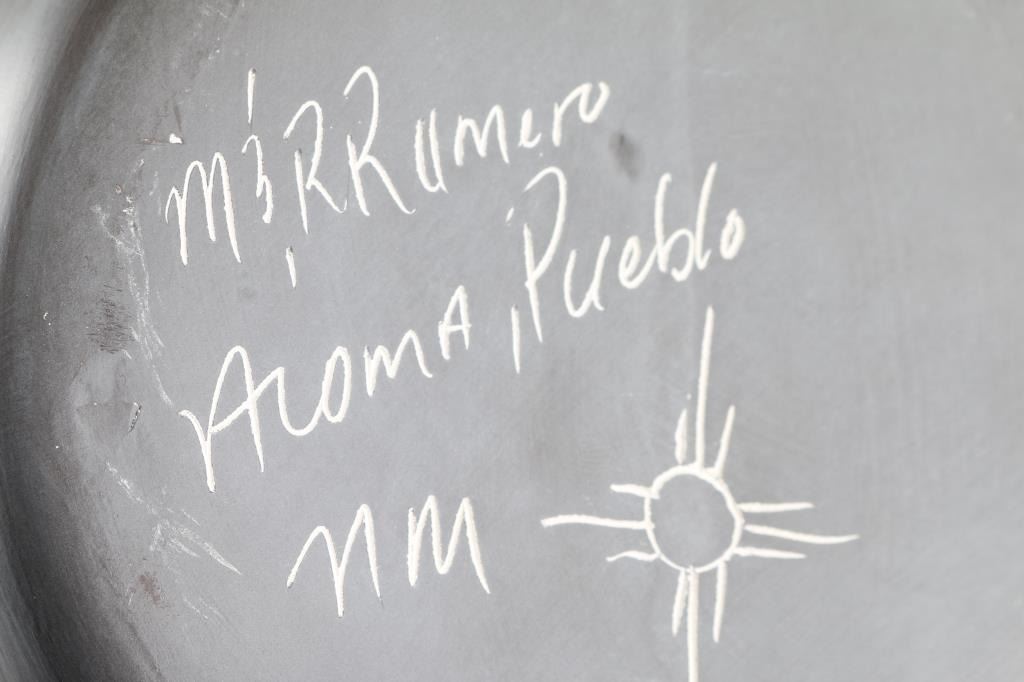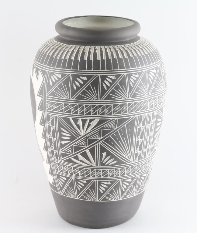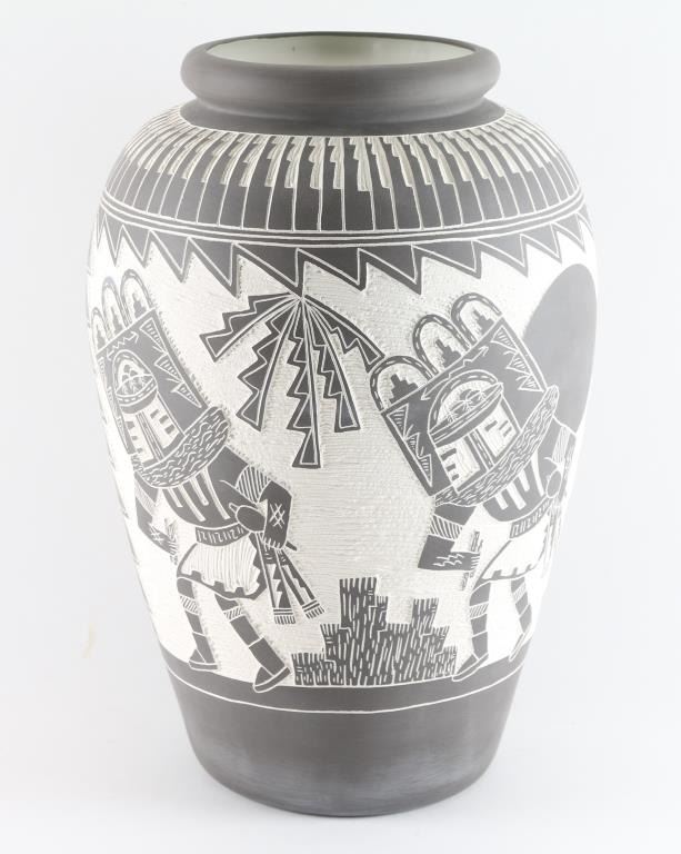 By New Mexican artist "M. Romero" , measuring 24inches tall and 6.5 at rim. Features beautiful Kachina design, signs on bottom of base.