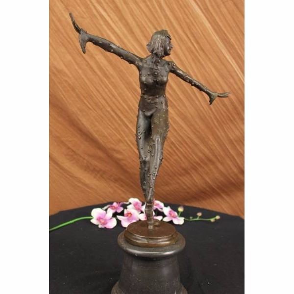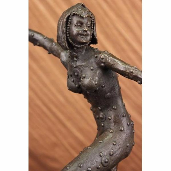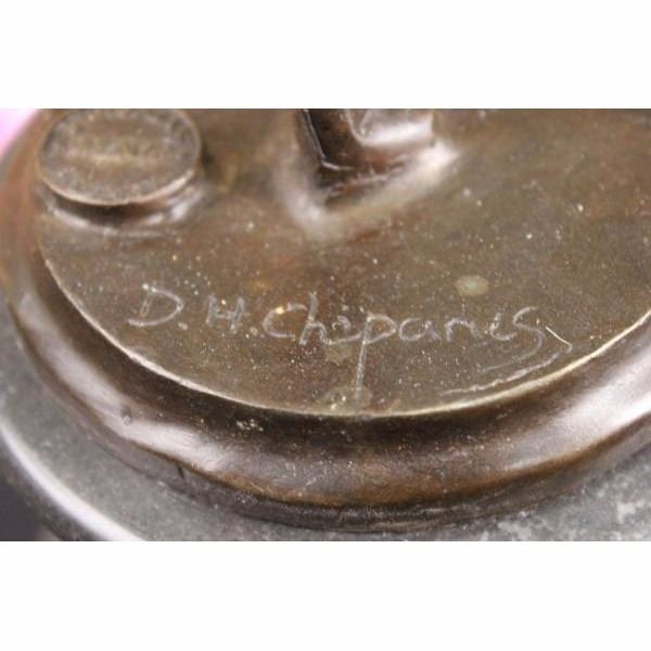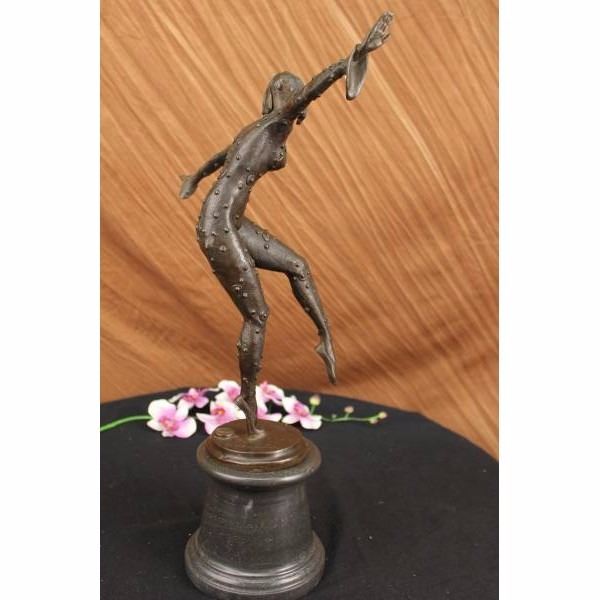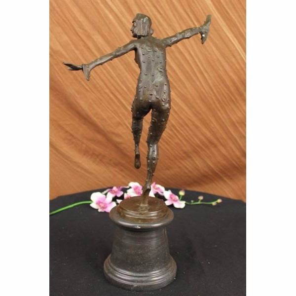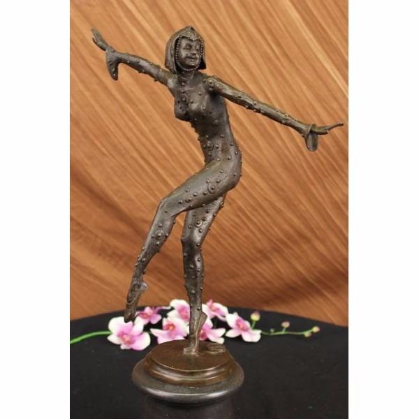 This lovely Chiparus dancer is performing for a crowd of people. She has this gorgeous body suit that covers her head to toe, designed with poka dots. She dances with both her arms extended out to her sides and her head moving from left to right to the music. she stretches her left leg up as she stands on the ball of her right foot. She is cast using the ancient old "Lost Wax Method" stained in a two tone brown patina. Mounted up top a black and marble base, Signed by the artist D.H. Chiparus. Condition: This sculpture is in perfect condition. Bronze Dimensions with Marble Base:Height 20" x Width 13" Marble Dimensions: diameter 6" . Height without base: 15" Weight : 15 LBS Inventory 97X21904379