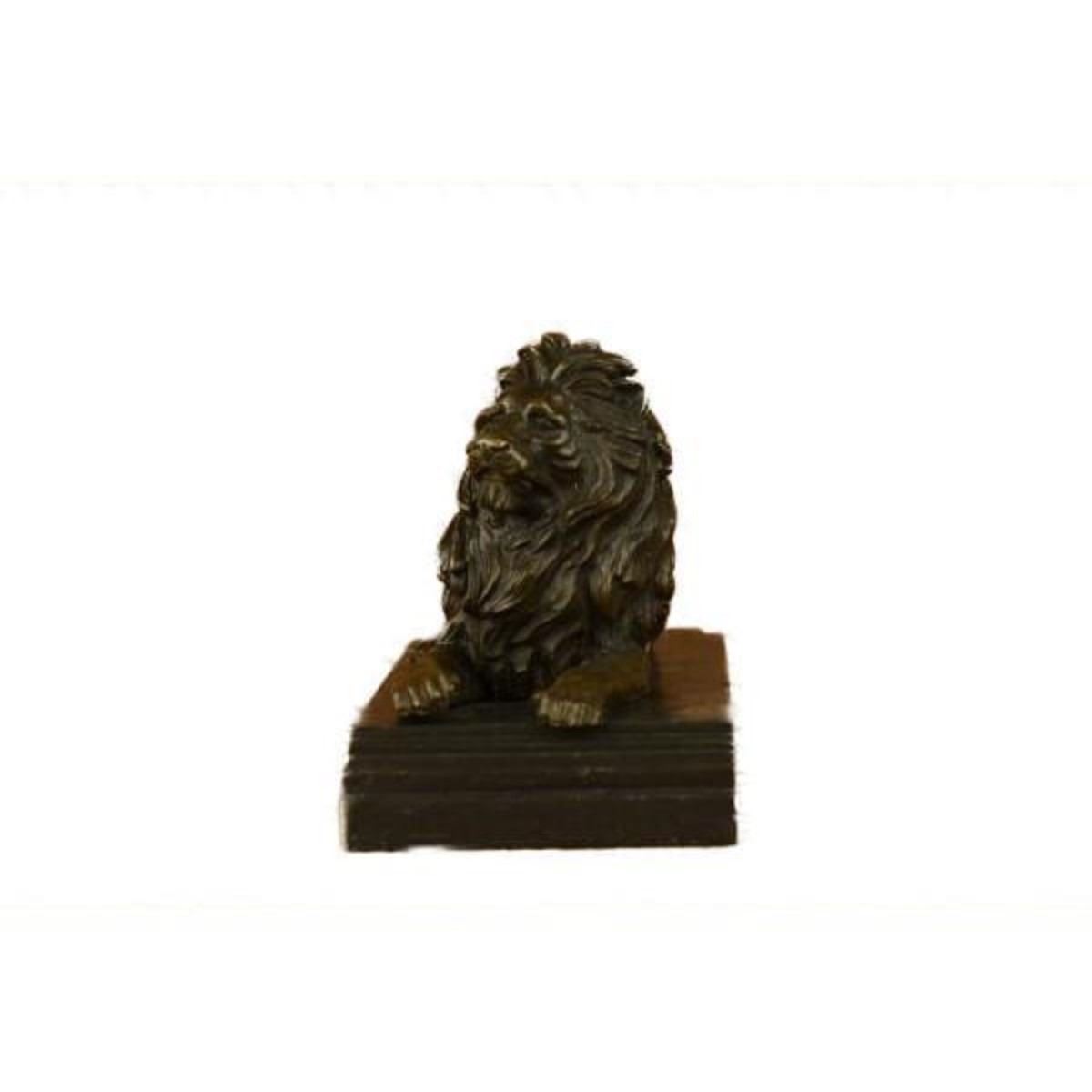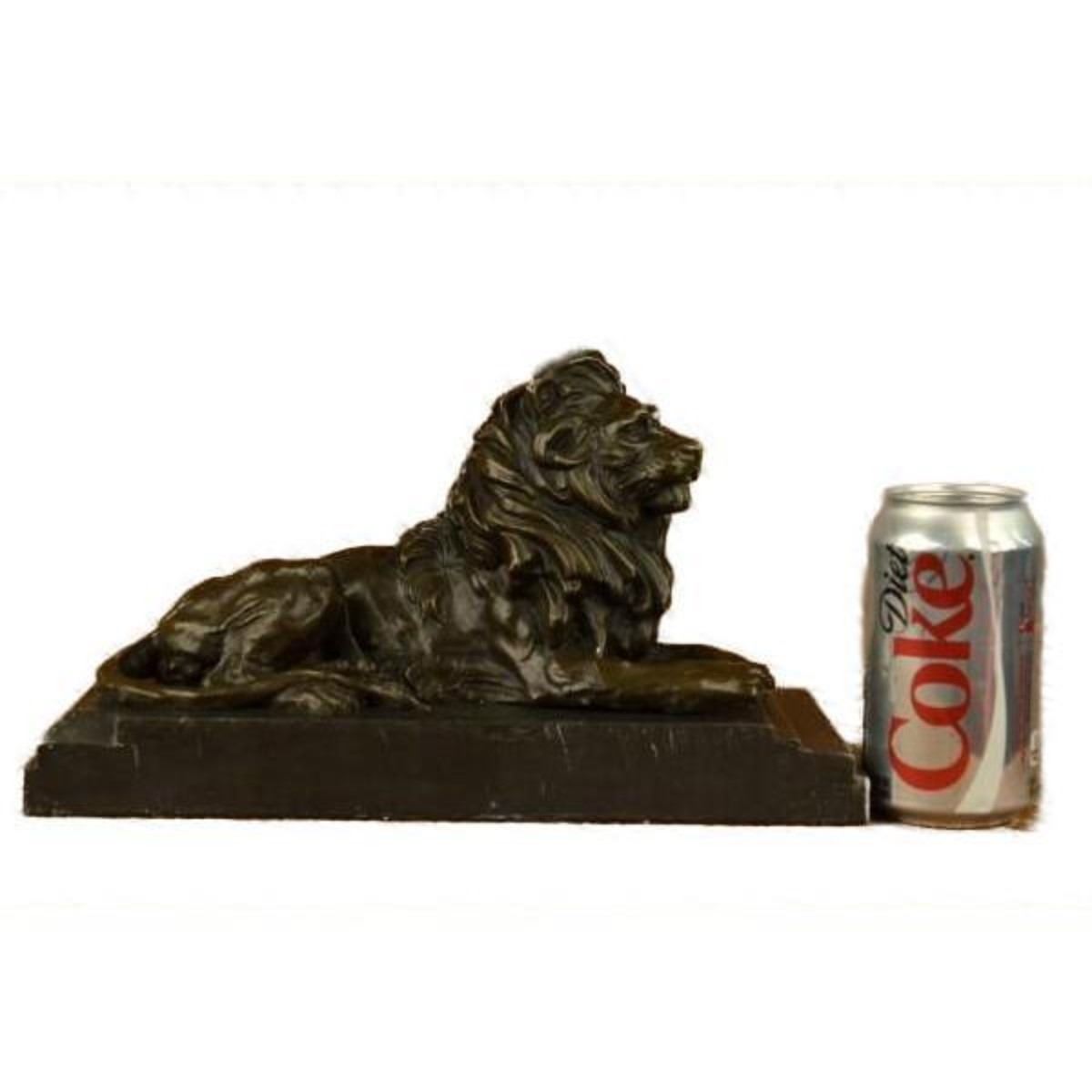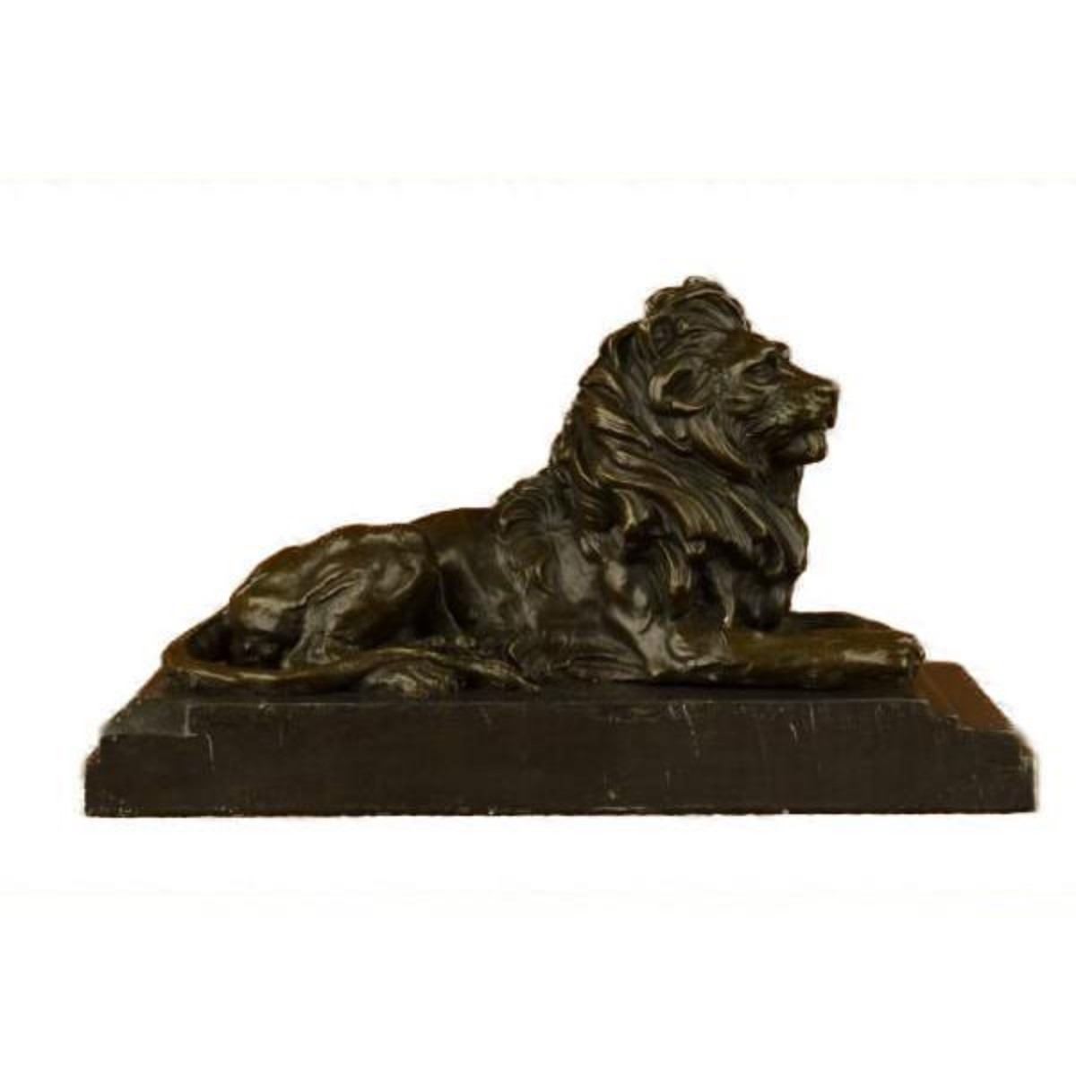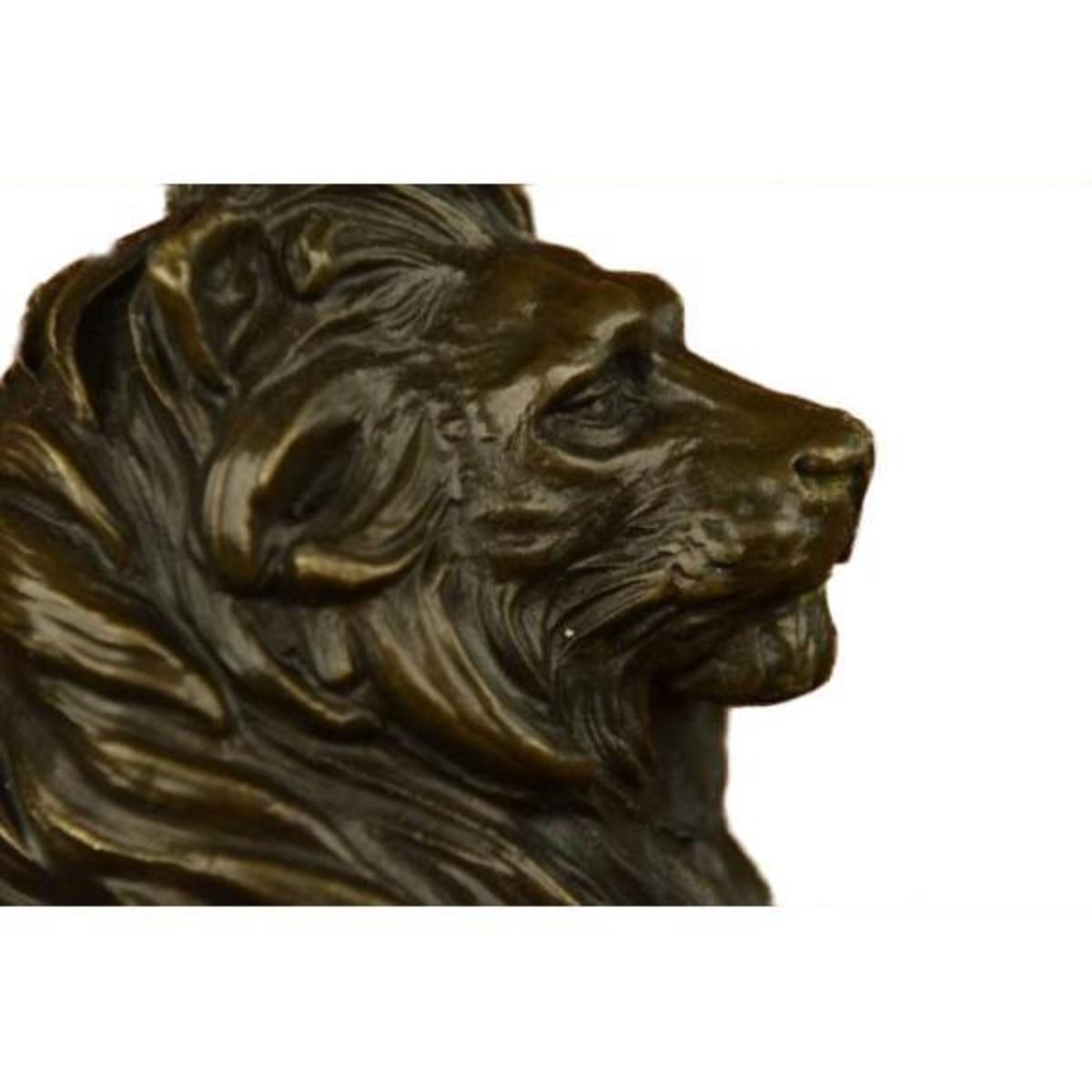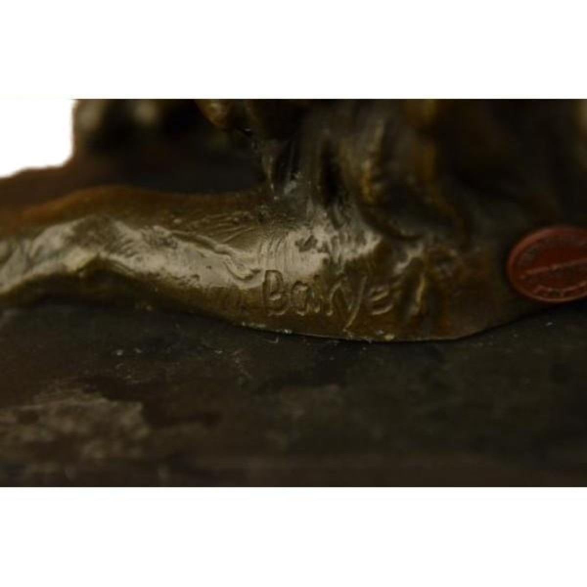 He's angry, hungry, and unrelenting. The lion's paws grip the ground, the tension spreads like a current from his paws to all the tendons in his body. His mouth is open wide in what can only be a ferocious roar meant to intimidate and warn the prey that its end is near. This piece was cast using the lost wax method. It stands on a smooth black marble base. It is signed by the artist Barye. Condition : this sculpture is in perfect condition. Bronze dimensions with marble base:height 7.5" x width 12" marble dimensions:12" x 5.5" height without base: 6.5" weight :12 lbs