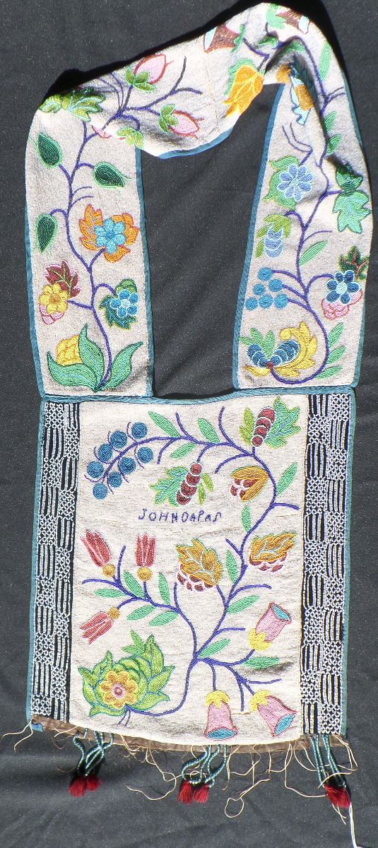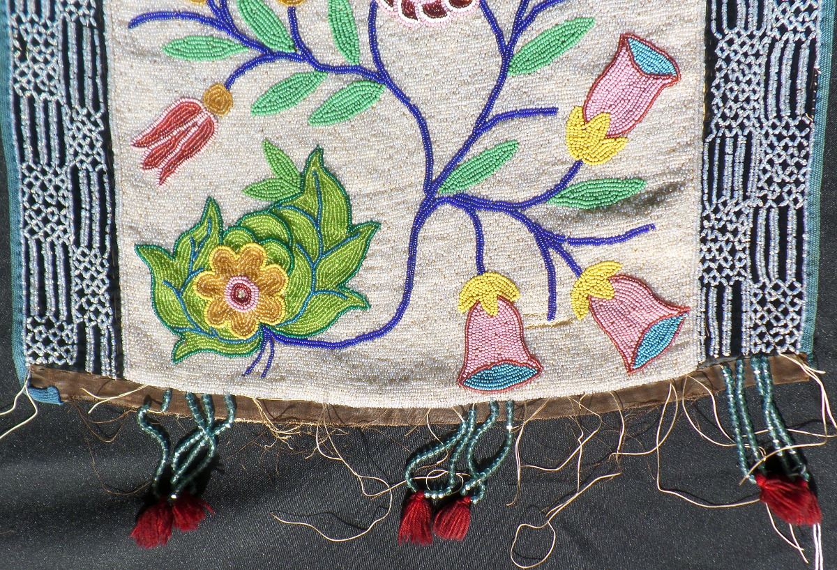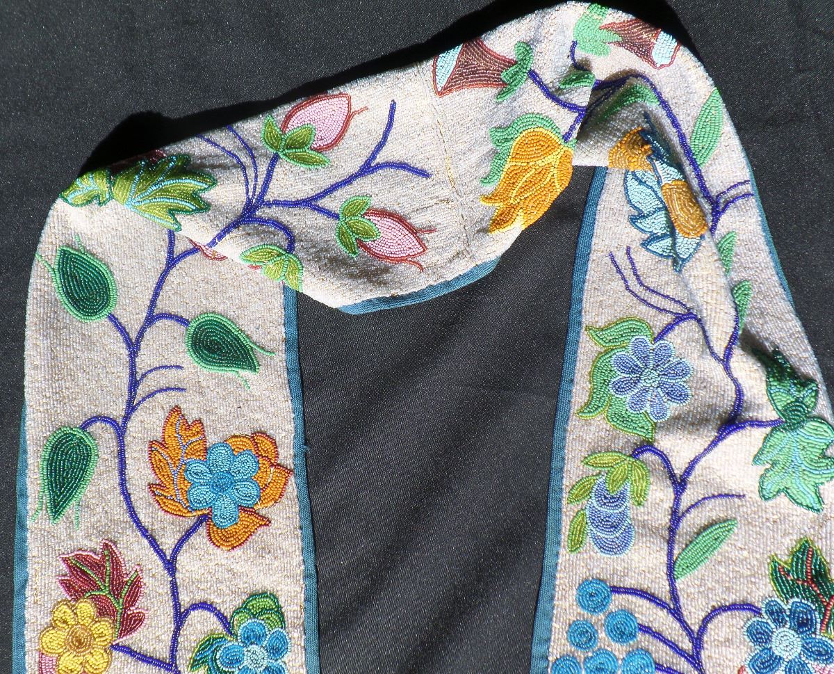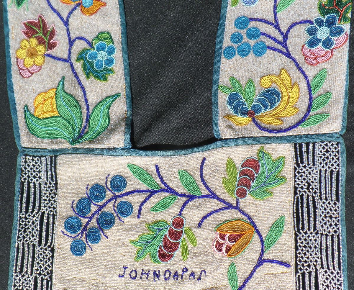Large Beaded Bandoleer, circa 1900. Made of cloth and glass beads, measures 43" x 17". From the Great Lakes area, USA. This is a very large one! Probably from Minnesota. Condition: Some bead loss, overall good condition, see images. Shipping: $24.