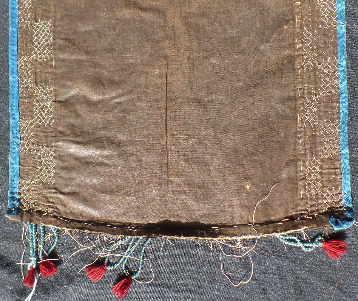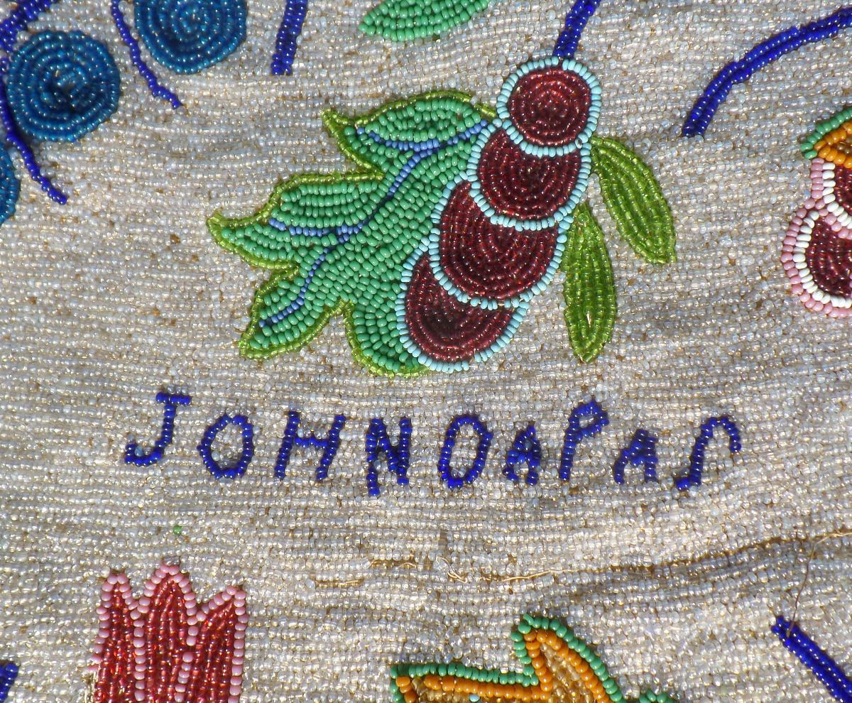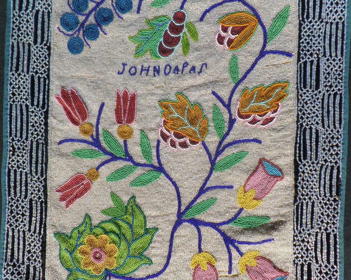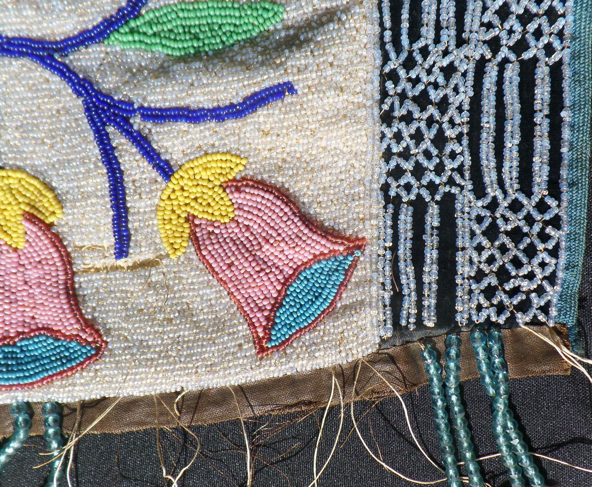 Large Beaded Bandoleer, circa 1900. Made of cloth and glass beads, measures 43" x 17". From the Great Lakes area, USA. This is a very large one! Probably from Minnesota. Condition: Some bead loss, overall good condition, see images. Shipping: $24.