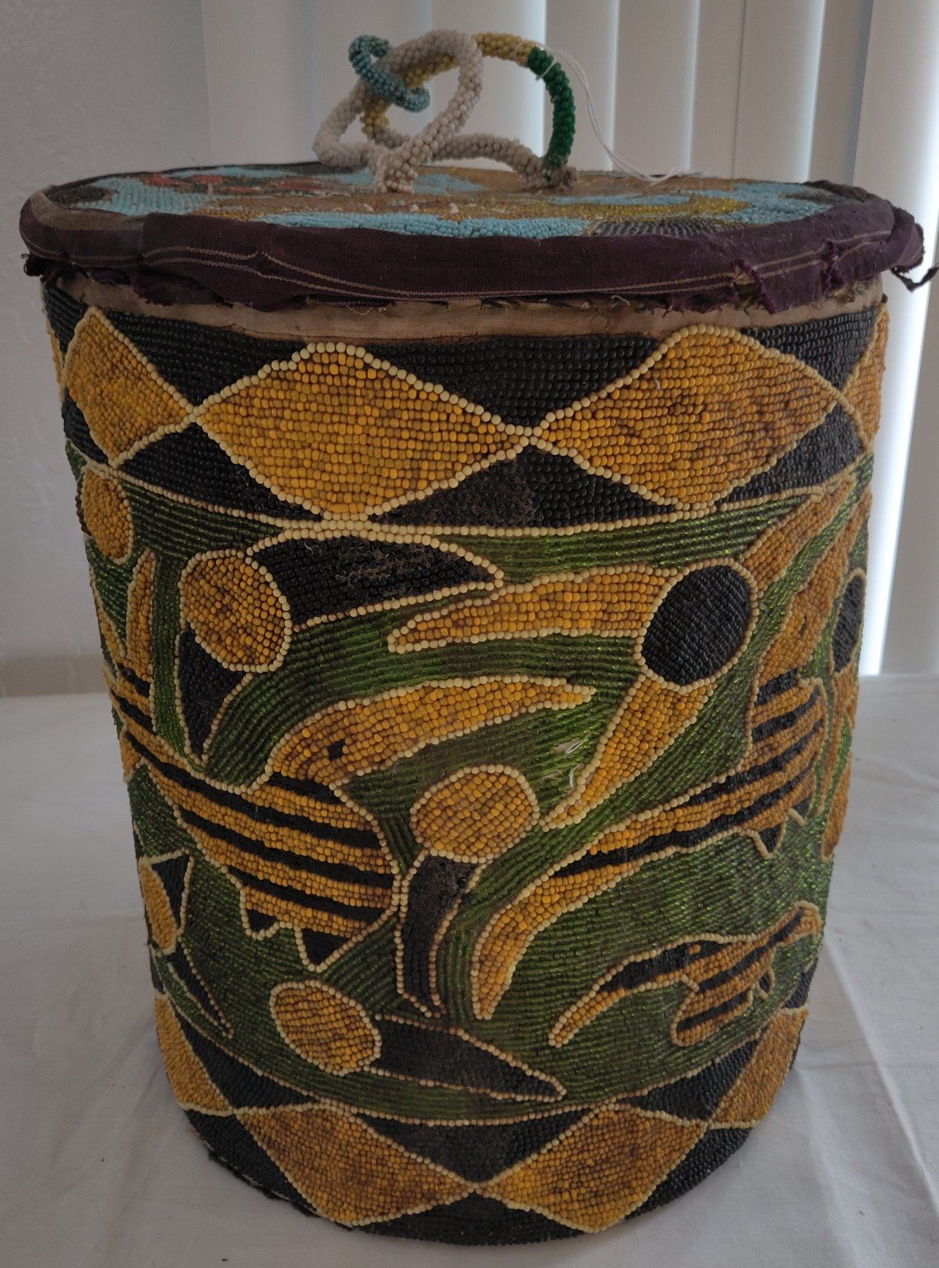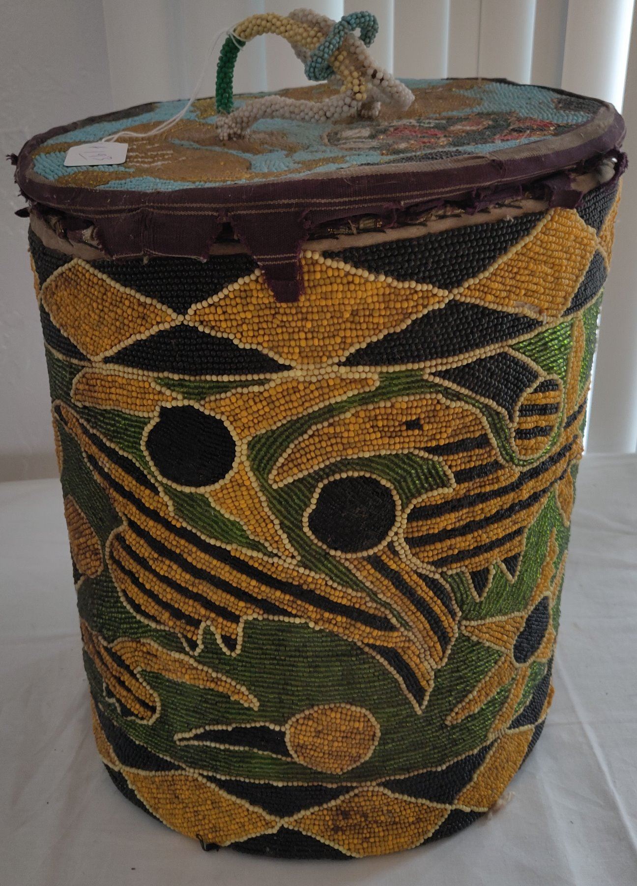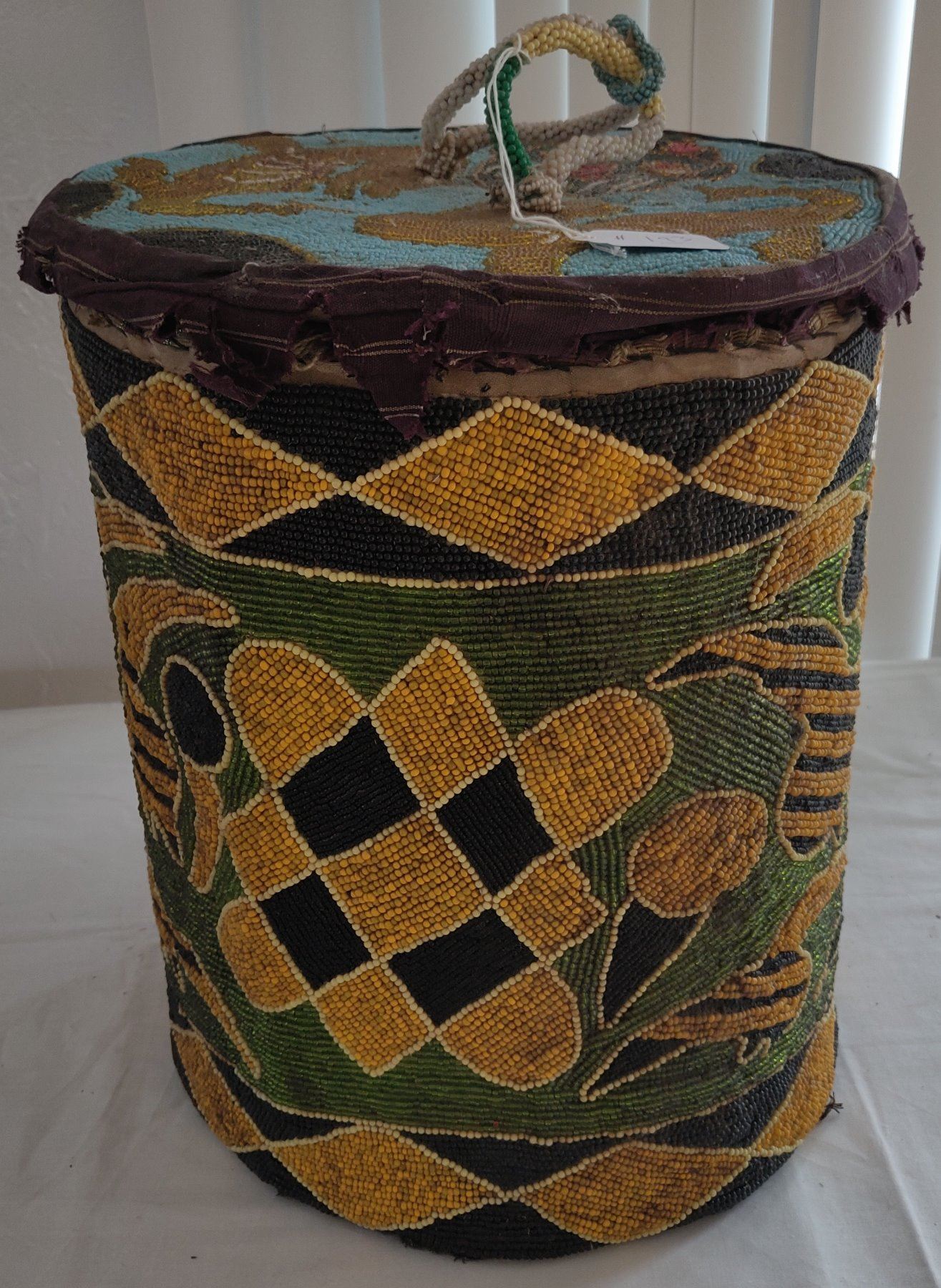 Large Beaded Cylinder, c. 1950s. Made of leather, glass beads and cloth, the item measures 14 1/2" tall x 11" wide. Nigeria, Yoruba, African. Condition: Some minor wear, see images. Shipping: $45.00 w/insurance and signature, due to size, weight and value.