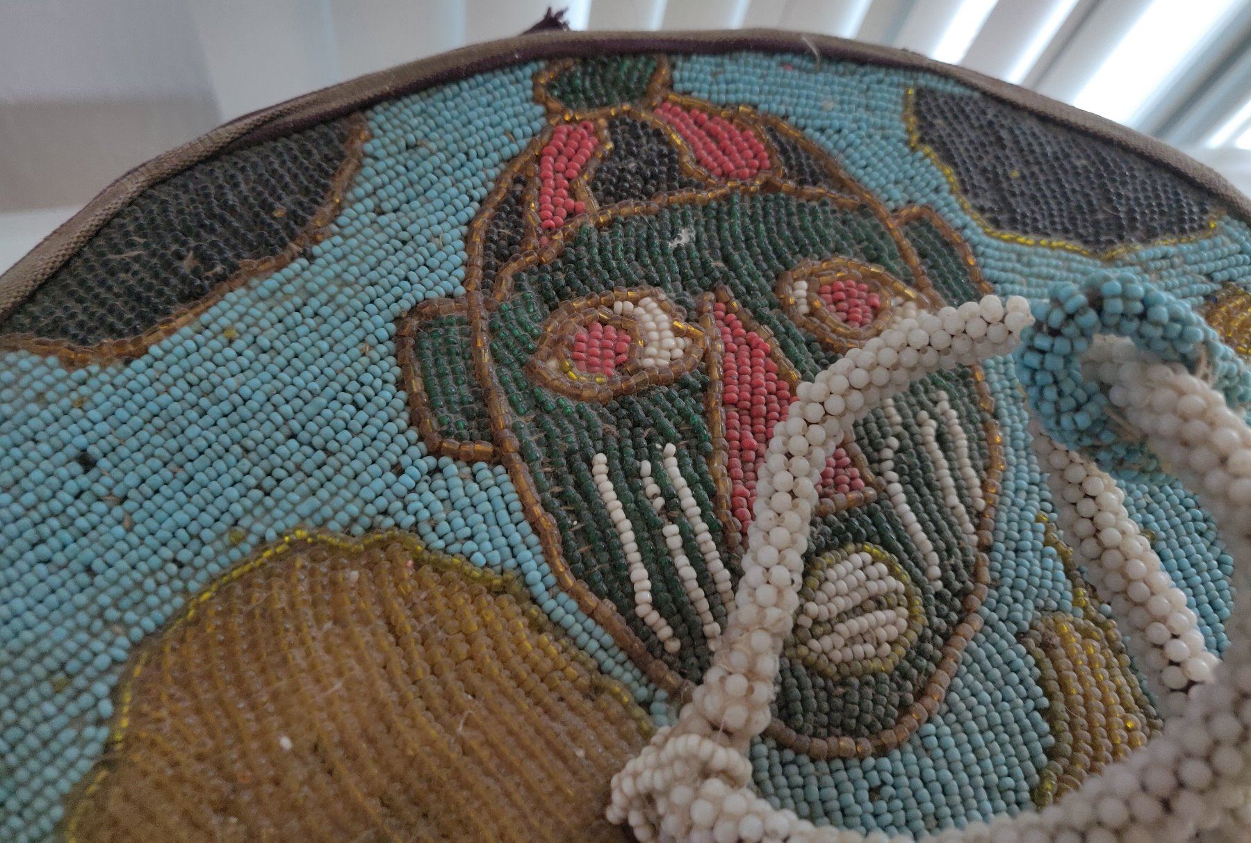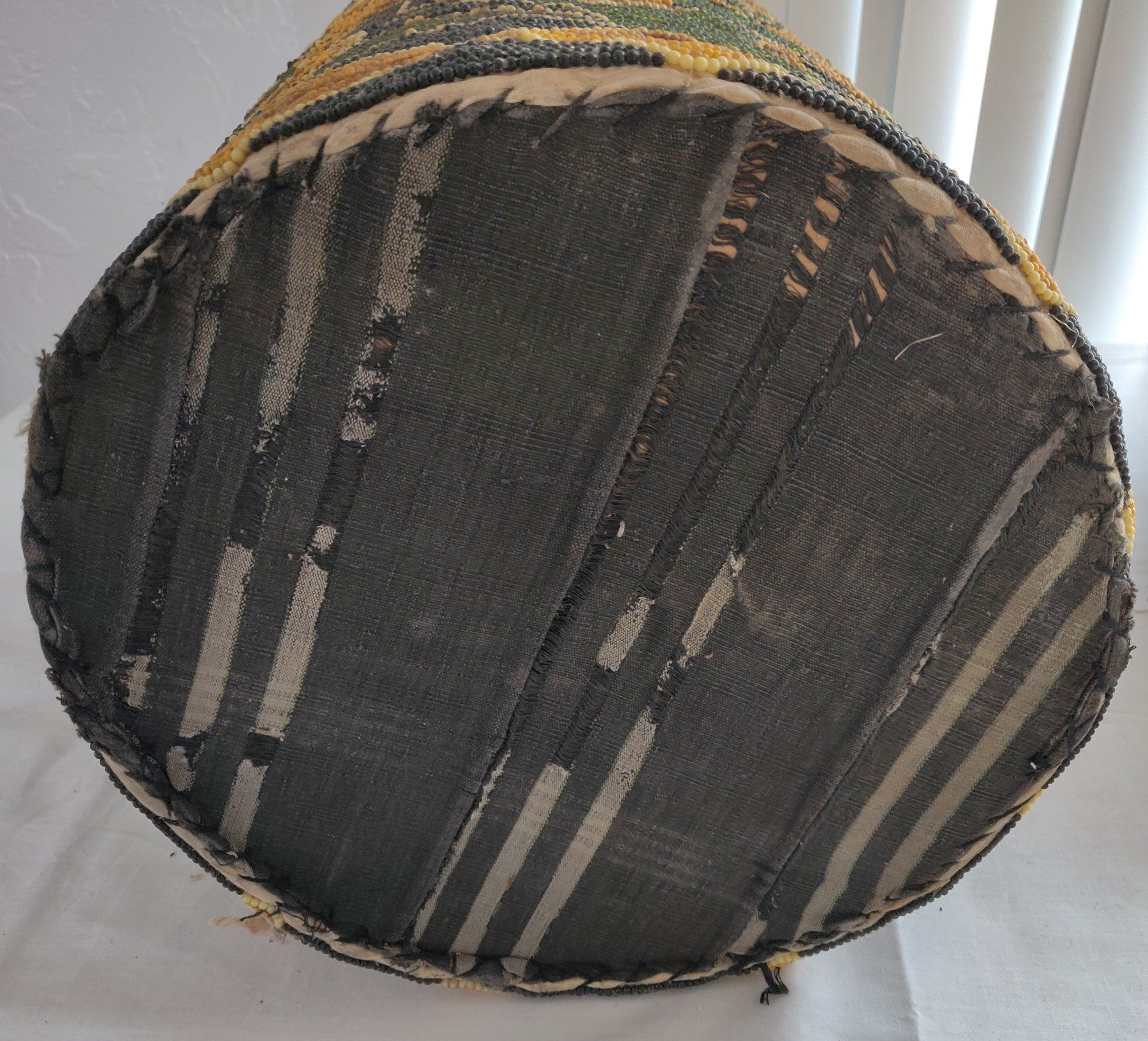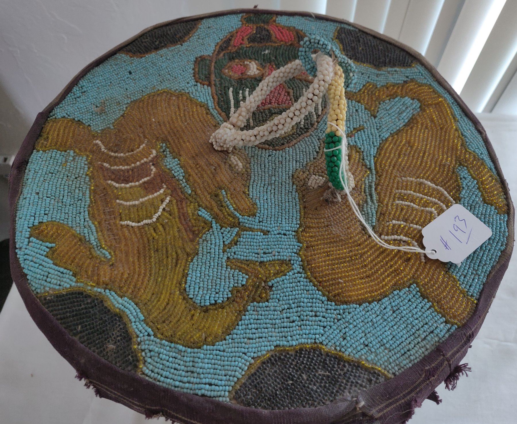 Large Beaded Cylinder, c. 1950s. Made of leather, glass beads and cloth, the item measures 14 1/2" tall x 11" wide. Nigeria, Yoruba, African. Condition: Some minor wear, see images. Shipping: $45.00 w/insurance and signature, due to size, weight and value.