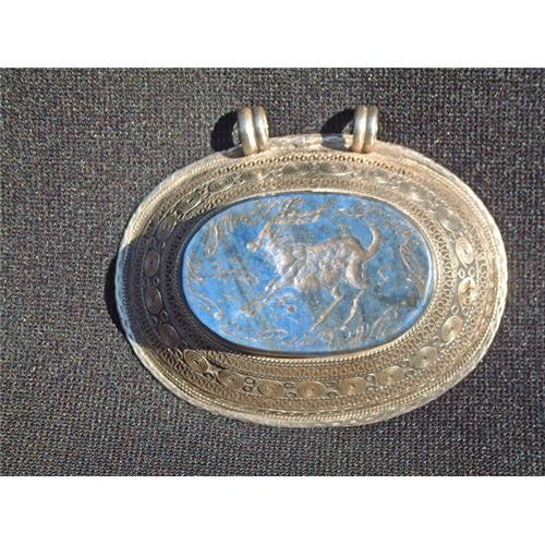 Heavy and large Bedouin silver pendant decorated with an inset central lapis lazuli decorated with intaglio incised ibex and inscription around. The inset stone appears to be considerably older than the silver mount and resembles the ancient Mesopotamian seals. The silver pendant has intricate filigree silver ornaments on silver background. Highest quality of lapis lazuli without inclusions. Size: 3.1" X 2.3" x 1" (8 X 6 X 2.5 cm.). Weight: 80.1 gm. Estimated value: $2000.
