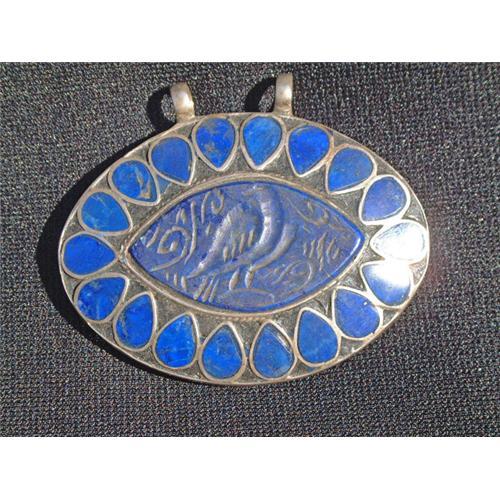 Large Bedouin silver pendant decorated with an inset central lapis lazuli decorated with intaglio featuring an incised eagle and inscription around. The inset stone appears to be considerably older than the silver mount and resembles the ancient Mesopotamian seals. The silver pendant has intricate filigree silver ornaments on silver background. Highest quality of lapis lazuli without inclusions. Size: 2.6" X 2" (6.5 X 5 cm.). Weight: 44.5 gm.