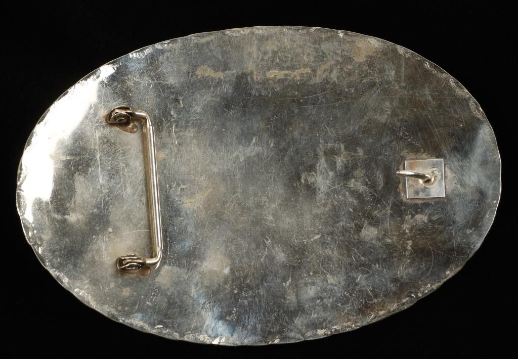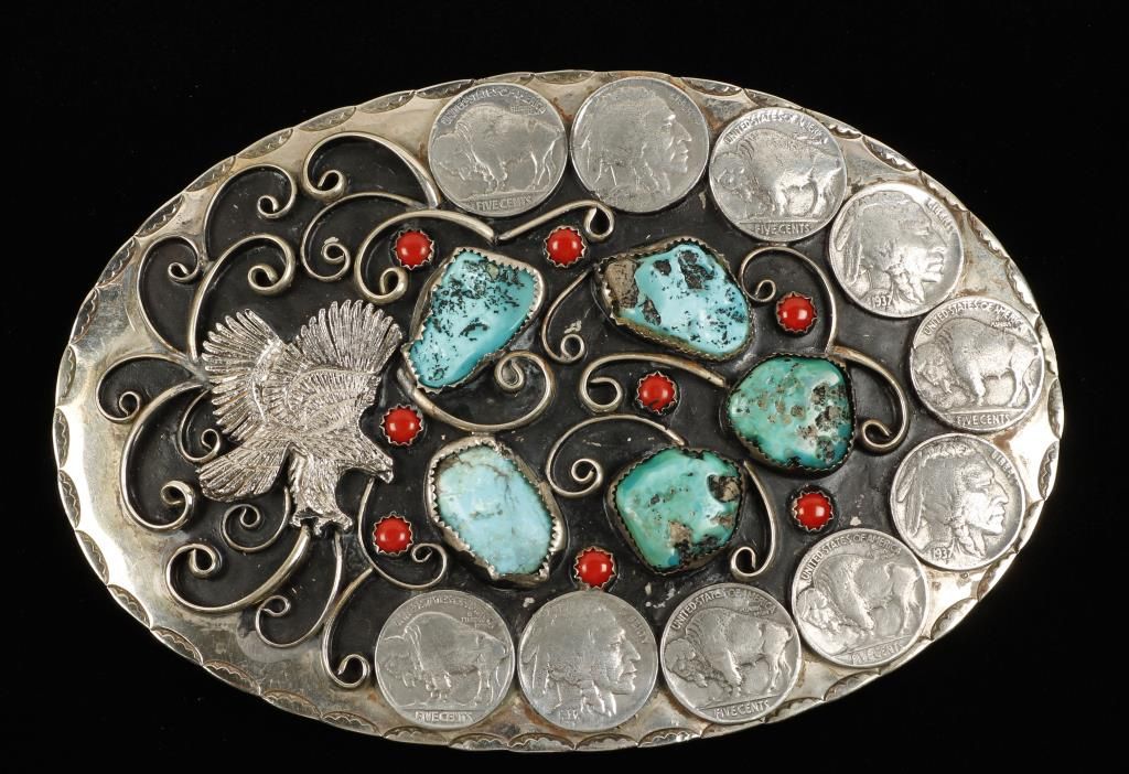 Very large belt buckle with rough turquoise and coral plus 10 buffalo nickels and an eagle. The buckle measures 6 1/4" by 4". It has been tested as being made out of nickel silver. There has been some repair on the back (replaced the prong), but repair is well done.