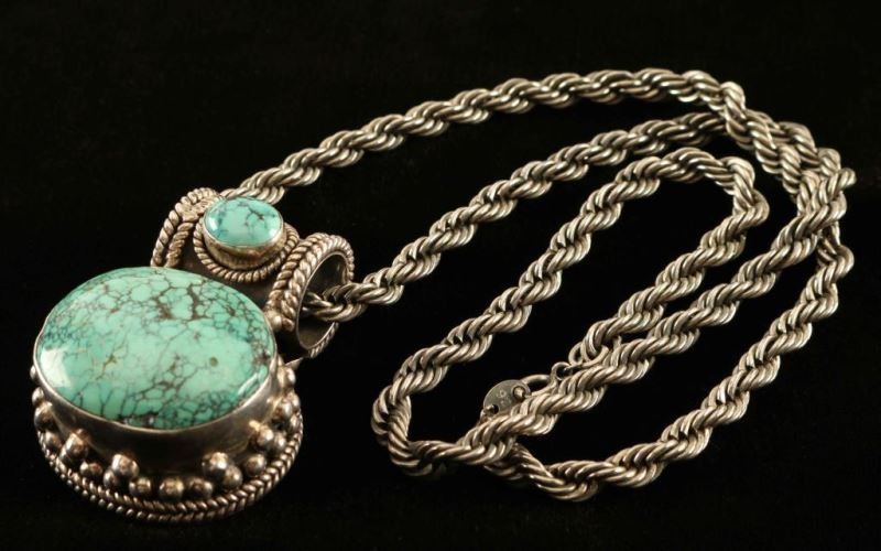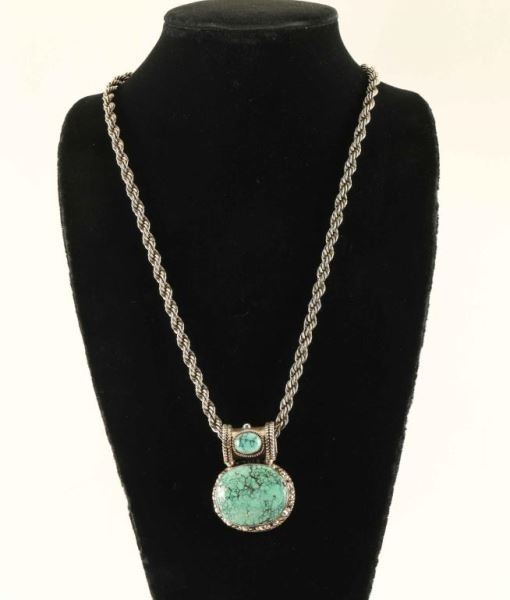 Beautiful blue green Bisbee oval topped with a smaller oval are both set in sterling silver with a bead and rope design. Marked '925' on a heavy silver rope chain. Very nice presentation.