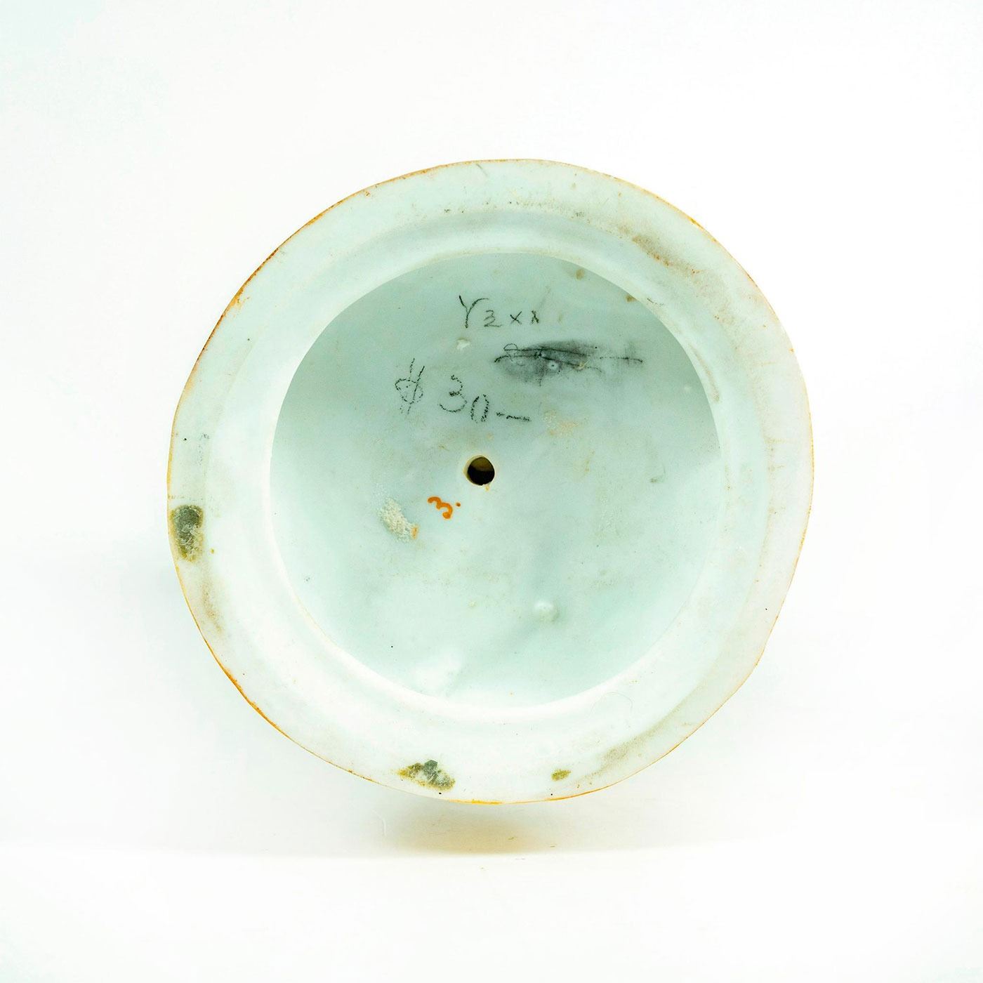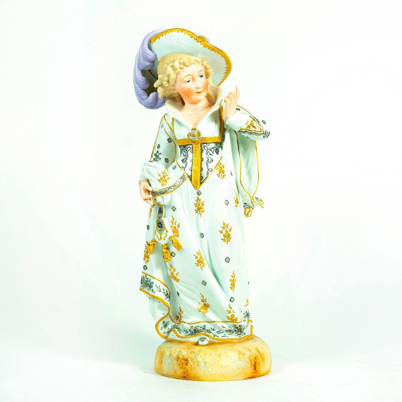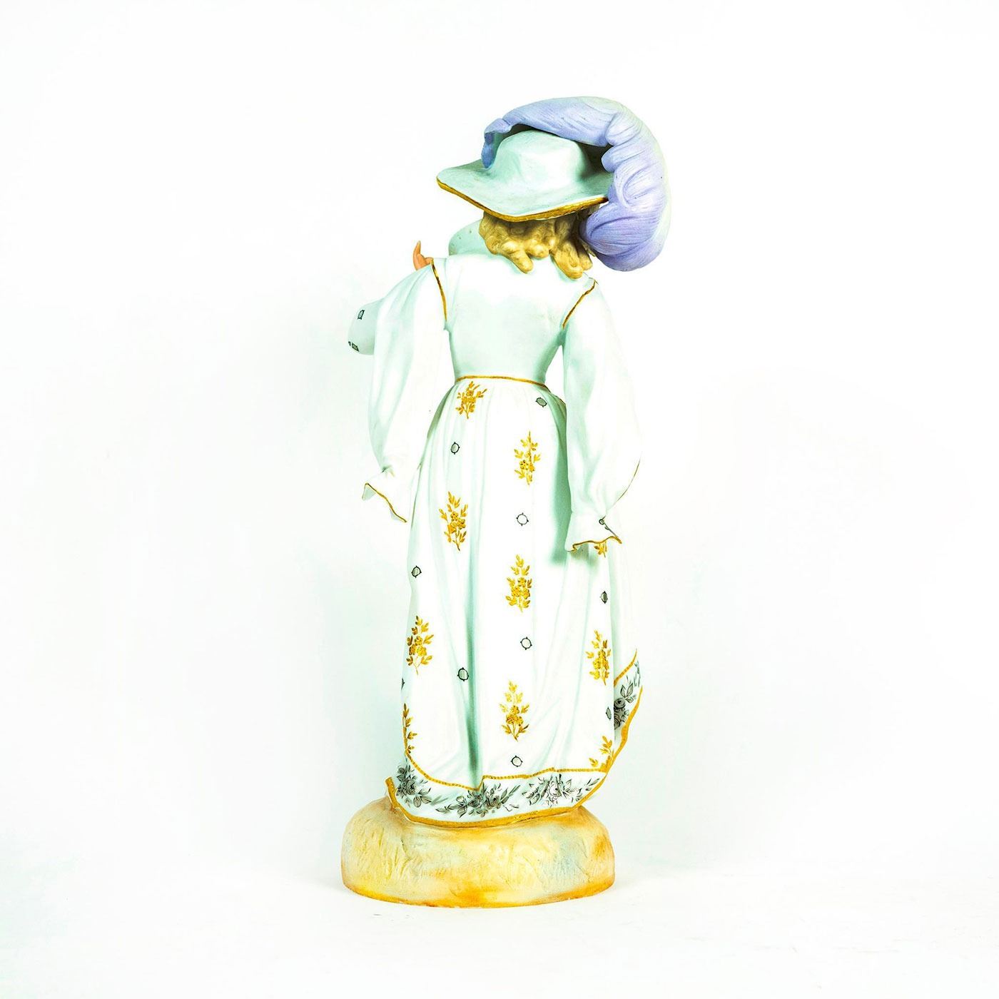 Hand decorated; lady standing in white and black dress and feathered hat; gilt highlights. One finger re-glued.