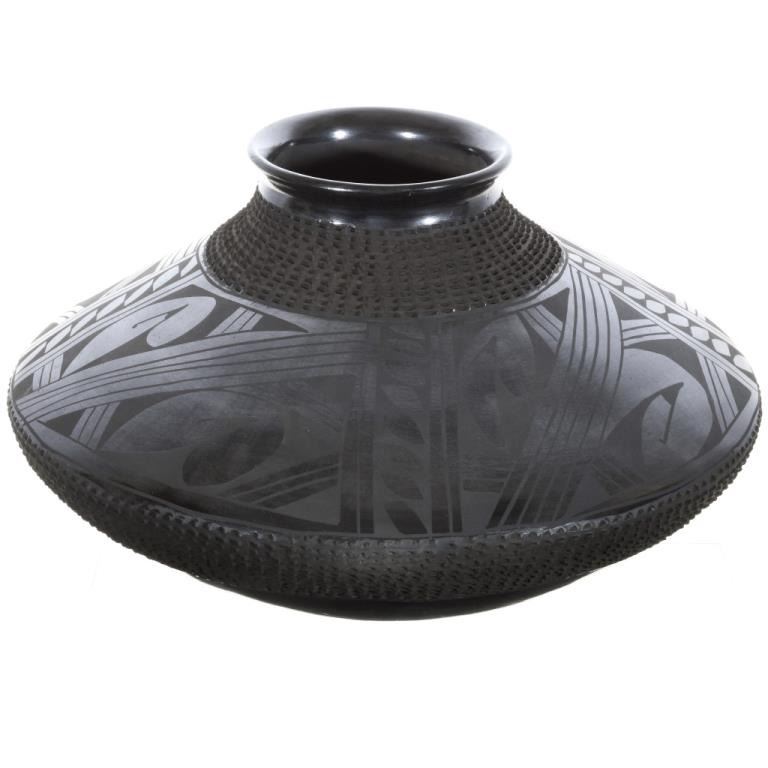 Really nice, low profile Cases Grandes blackware. Hand built, it features regional designs that are similar to Hopi patterns. It’s finished textured patterns on the top and bottom. A stone rubbing brings out the high shine of the regional clay. 8" tall and 13" wide. It's signed by Lucie Soto.