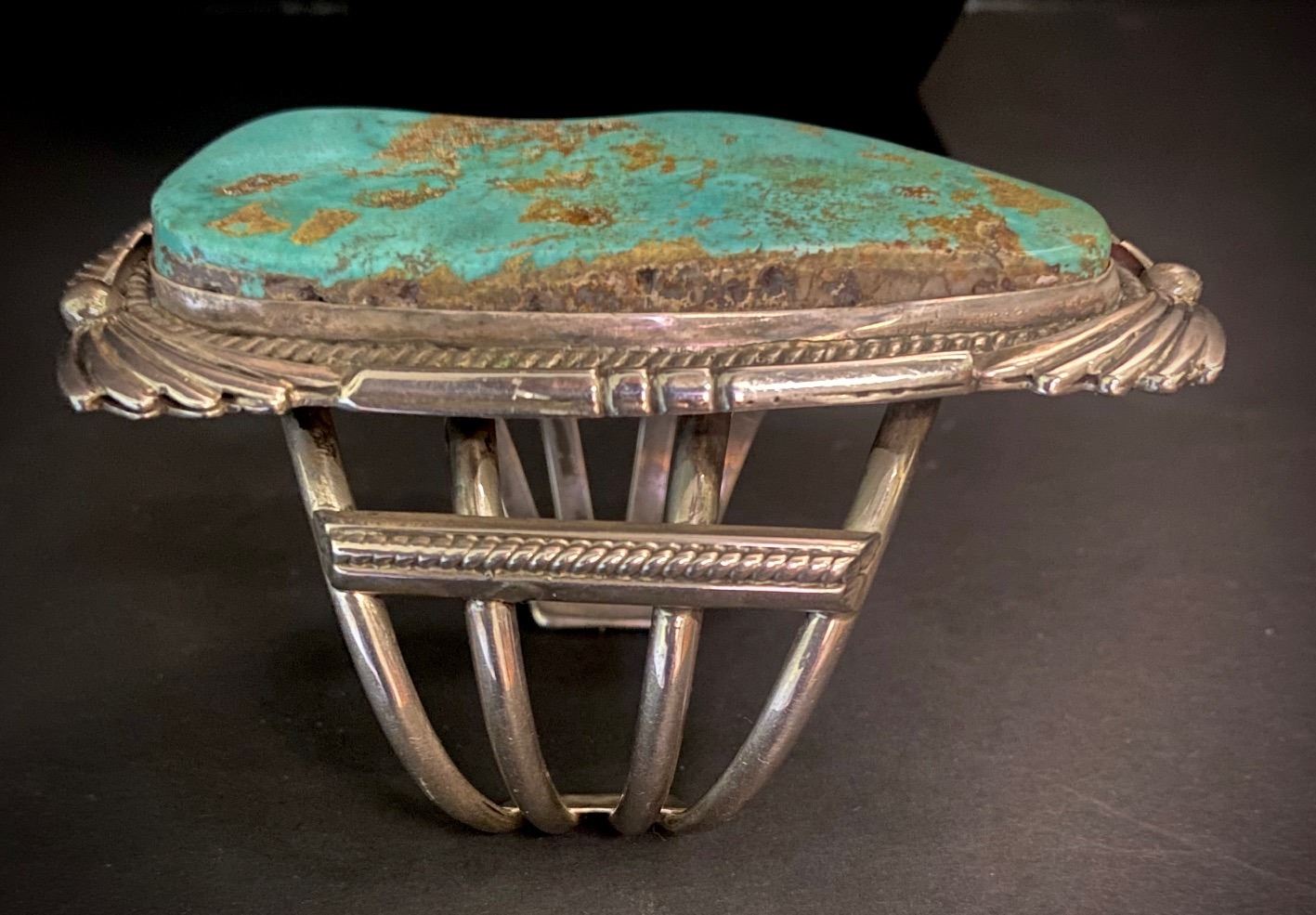 Bracelets measurements are opening, inside circumference, height. Weights are in Grams and are weighed to the best of our ability. The term signed means that, in our opinion, the signature is by the artist. All dating, Turquoise and hallmark attributions are to the best of our knowledge. Attributions are subjective and should be taken as such. Attributions in the description of any lot is left to the buyer to determine accuracy and the gallery is not responsible for any errors or omissions.