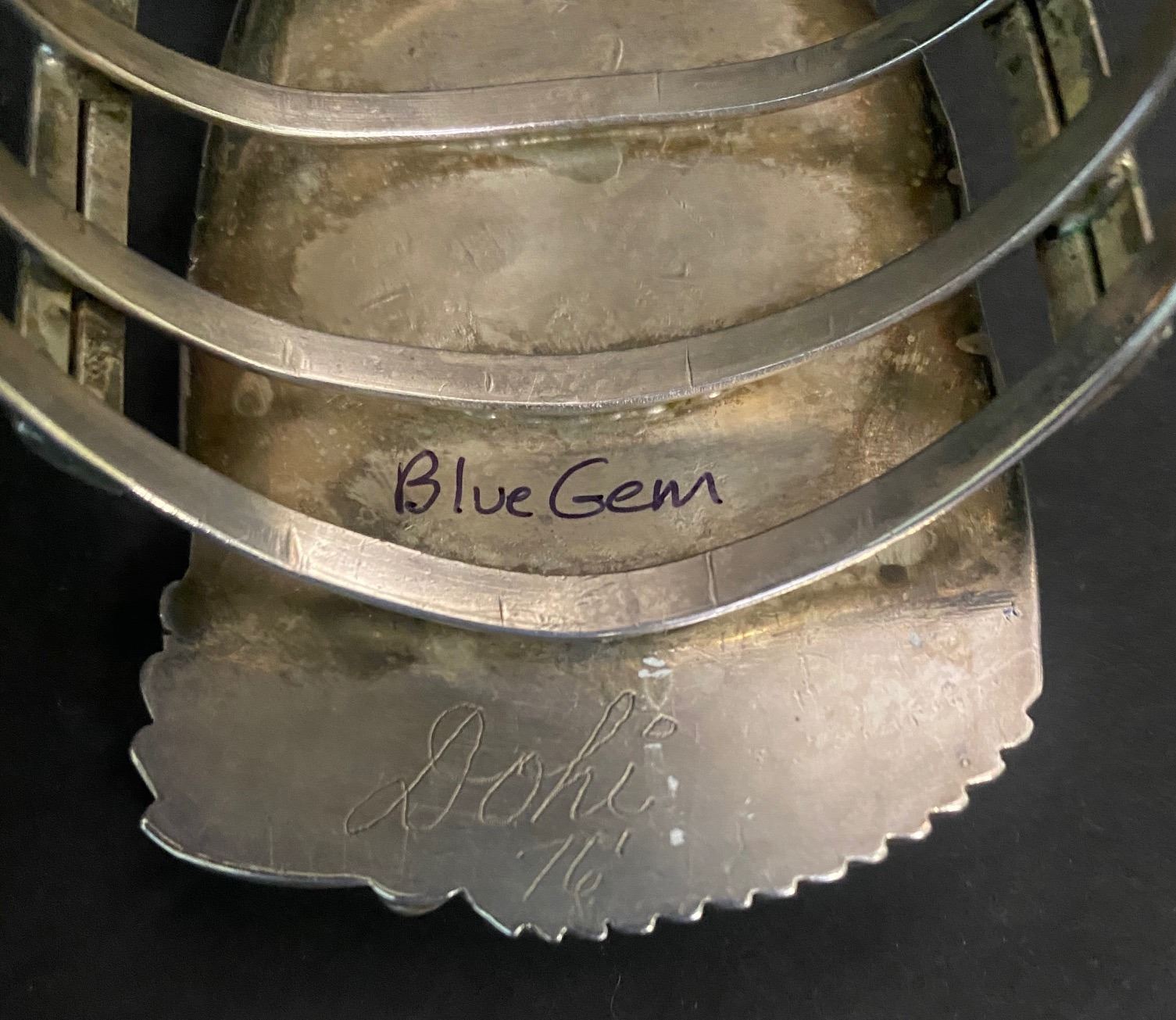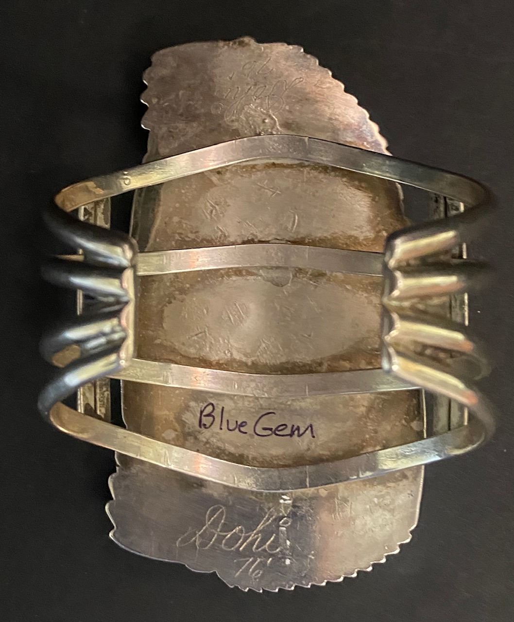 Large Blue Gem Cuff hallmark Dohi 76' 4"H X 2 5/8"W X 5 1/3"inside X 1 3/8" opening. 167 grams. This is a wow piece.