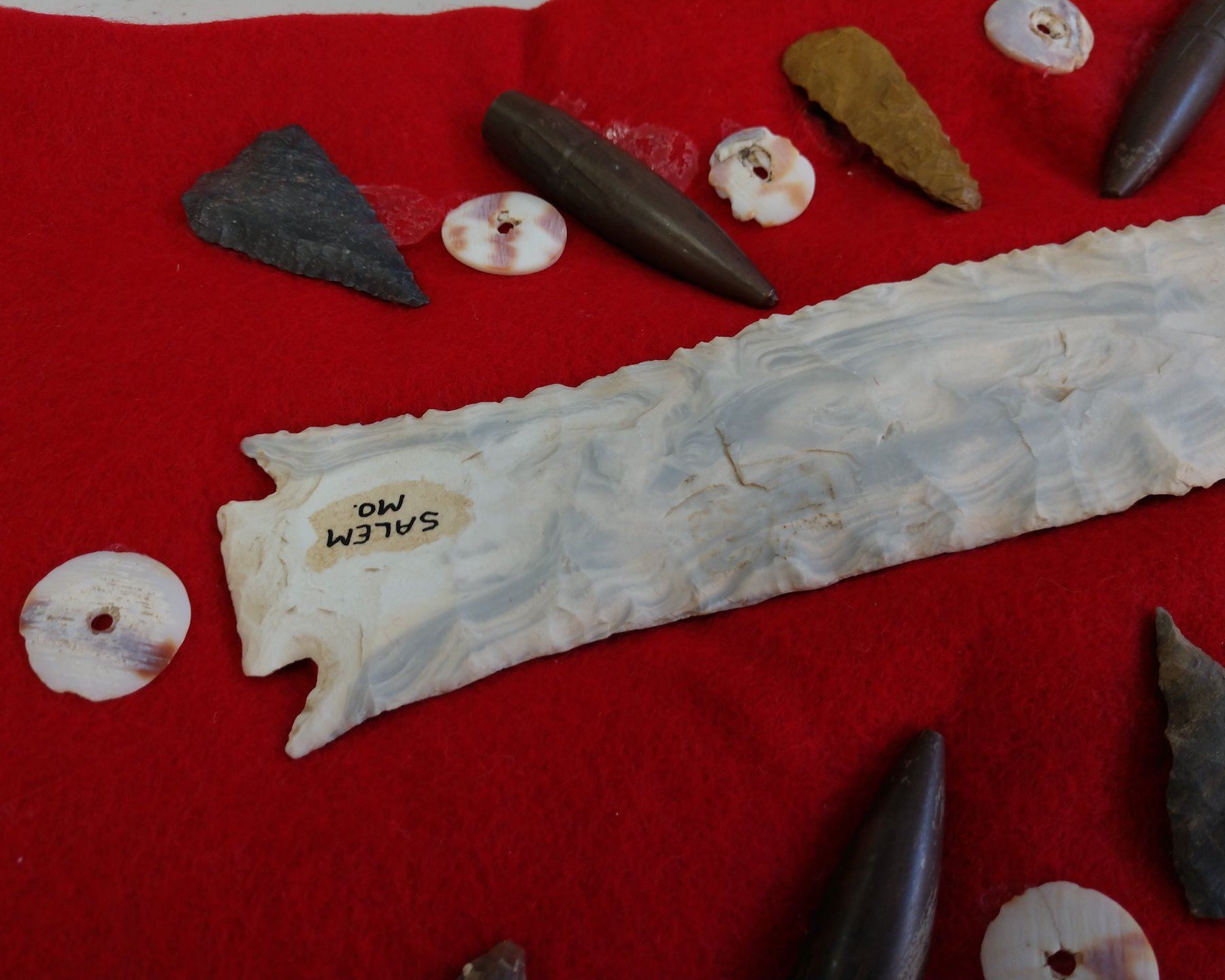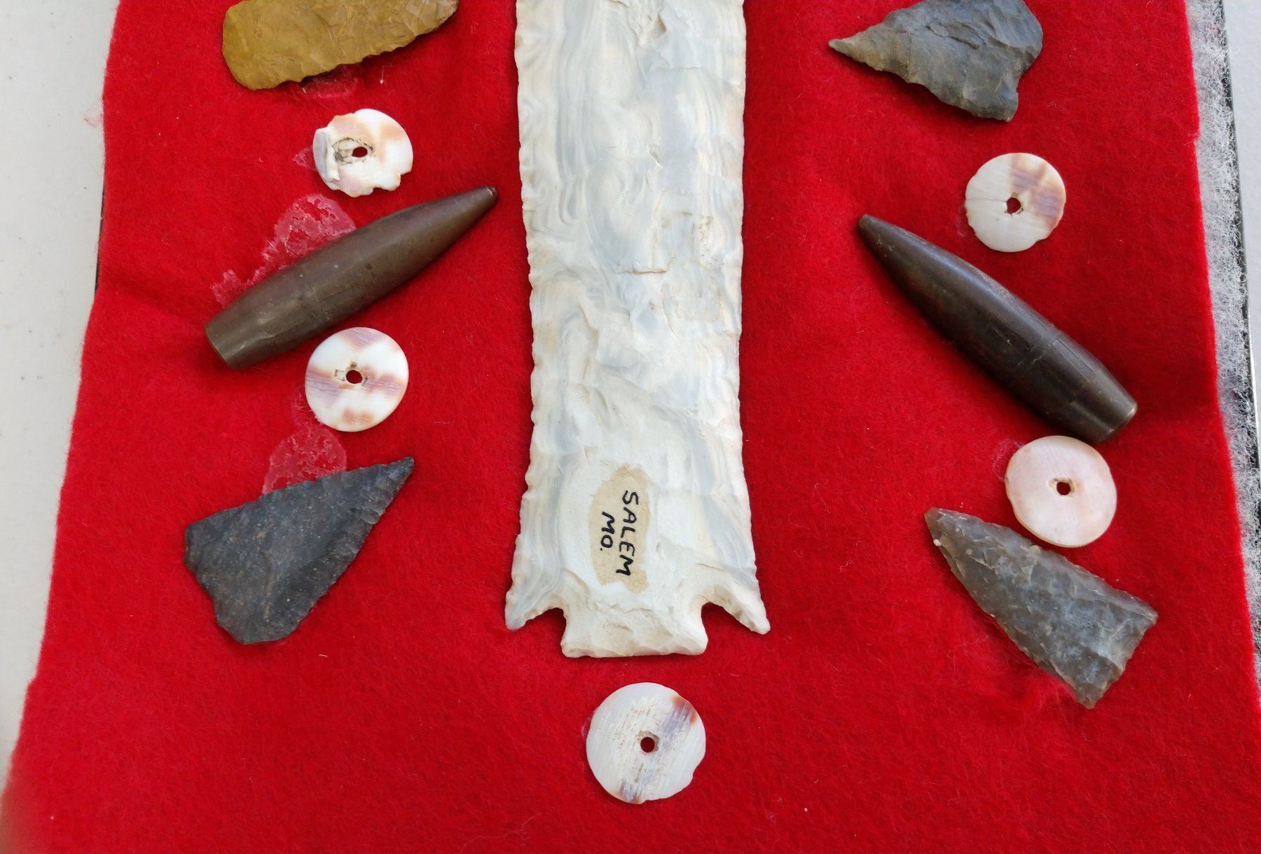 Large Blue & White Spear, pre-historic item. Made of rare blue chert, the item measures 8 1/2" long. Missouri. Includes bullets, points and shell. Frame not included. Condition: Good, see images. Shipping: $22.50 w/insurance and signature.