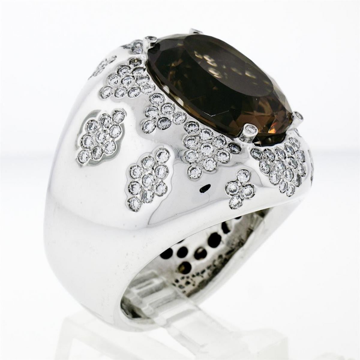 Large Bold 18K White Gold Oval Smoky Quartz 2.50ct Diamond Cluster Cocktail Ring. A large solid 18k white gold cocktail ring featuring an oval cut natural smoky quartz solitaire (18.75x14.20mm) accented by 134 round brilliant cut natural diamonds (G/H - VS1/VS2; 2.50ctw). The ring is size 10.0, weighs a total of 30.85 grams, and measures 28.25mm wide.