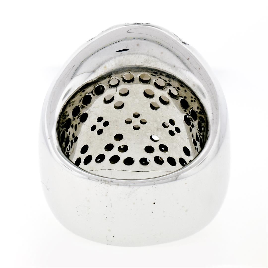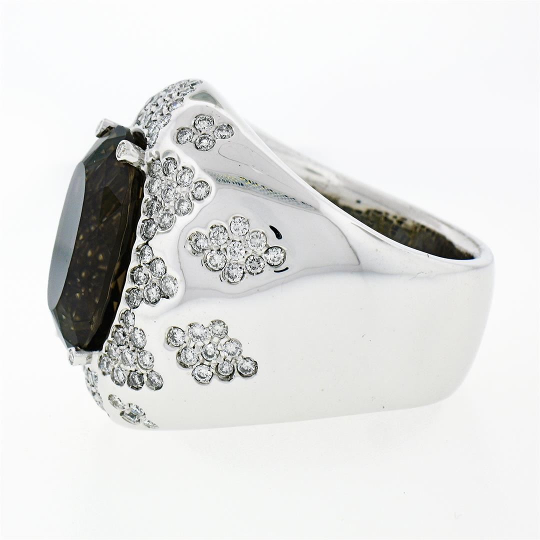 An estate solid 18k whte gold cocktail ring, with 1 oval cut natural smoky quartz (18.75x14.20mm), and 134 round brilliant cut natural diamonds (G/H- VS1/VS2 ; 2.50ctw). The ring is size 10, weighs a total of 30.85 grams, and measures 28.25mm wide.