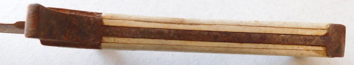 Large Bone Handle Bowie from 1860's. This item measures 18 x 3 3/4 inches and is made of steel, brass and bone. It was found in abandoned farm house in Eastern Missouri. The Bowie is marked DUFILHO, New Orleans. There is lots of rust. Shipping: $30.00