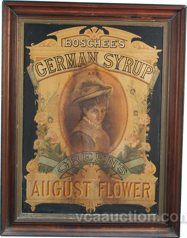 Large Boschee's German Syrup And Green's August Flower Tin Sign, by Wells & Hope Co. in original embossed wood frame - 28" x 36"
