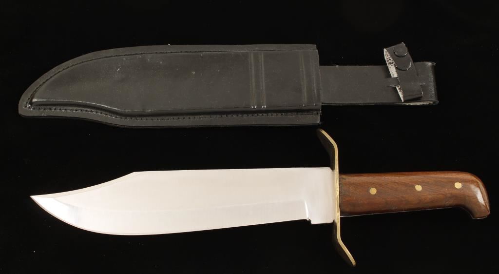 Brass guard, wood handle and 10" blade. Includes smooth black leather knife sheath.