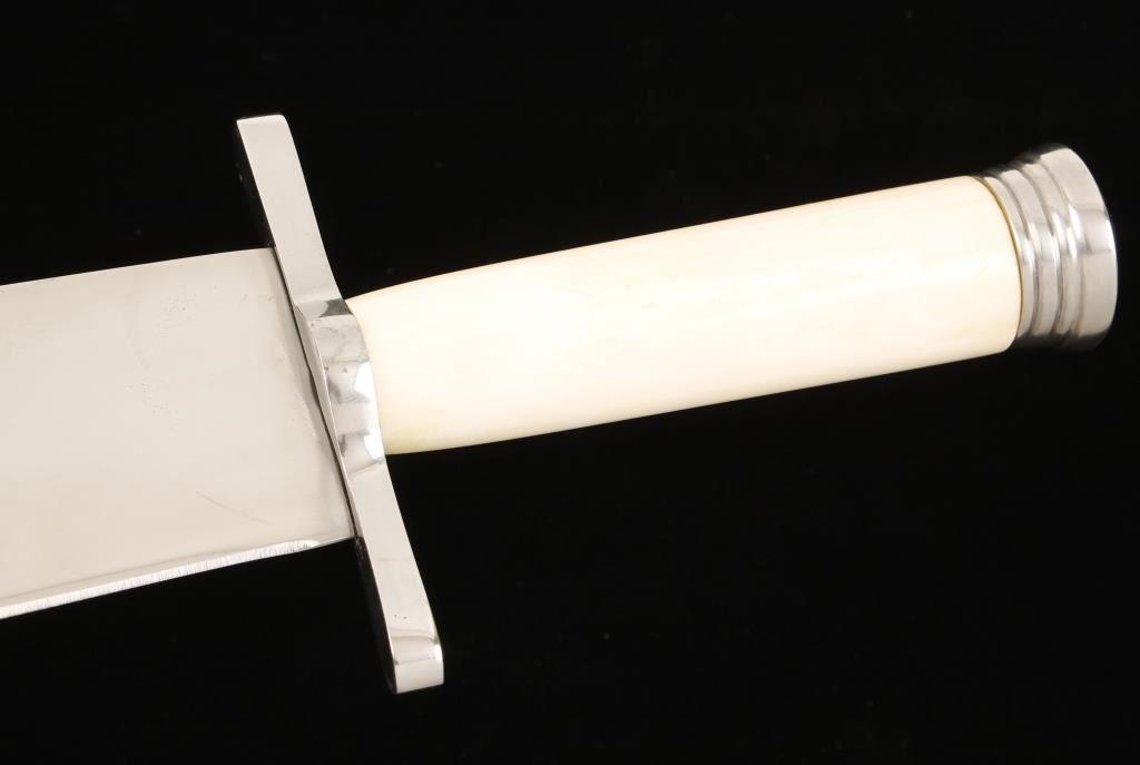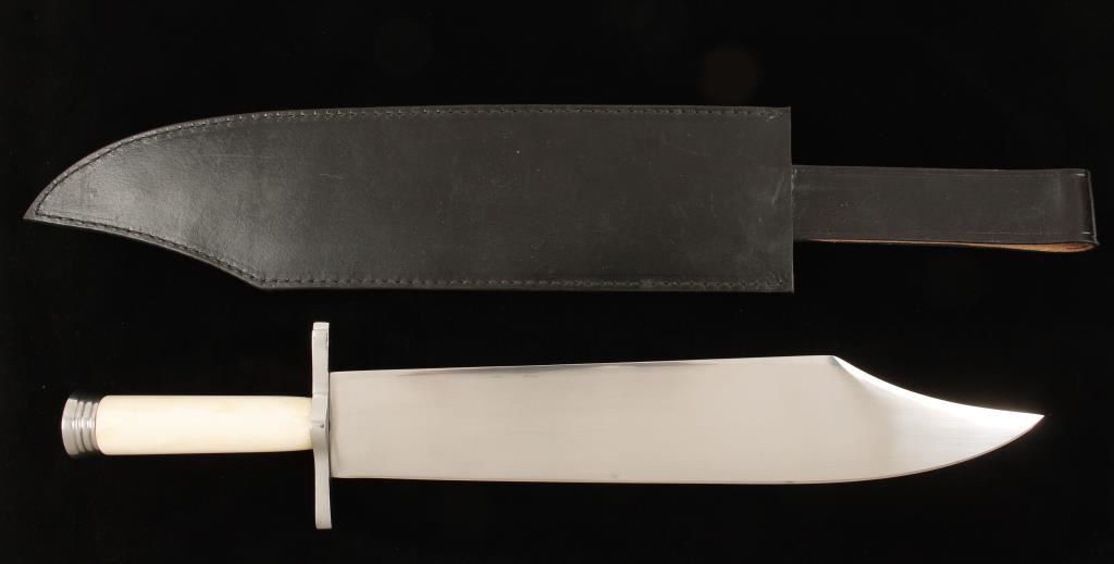 Faux ivory handle, stainless steel blade and guard. Blade measures 14" with smooth black leather sheath.