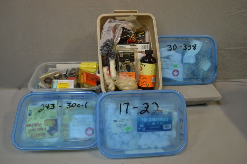 Large Box : Three plastic trays full of various caliber patches - tray full of bags of various patches, bore snakes, Hoppes bore cleaner, plastic tray full of scope rings, bases, sights, etc.