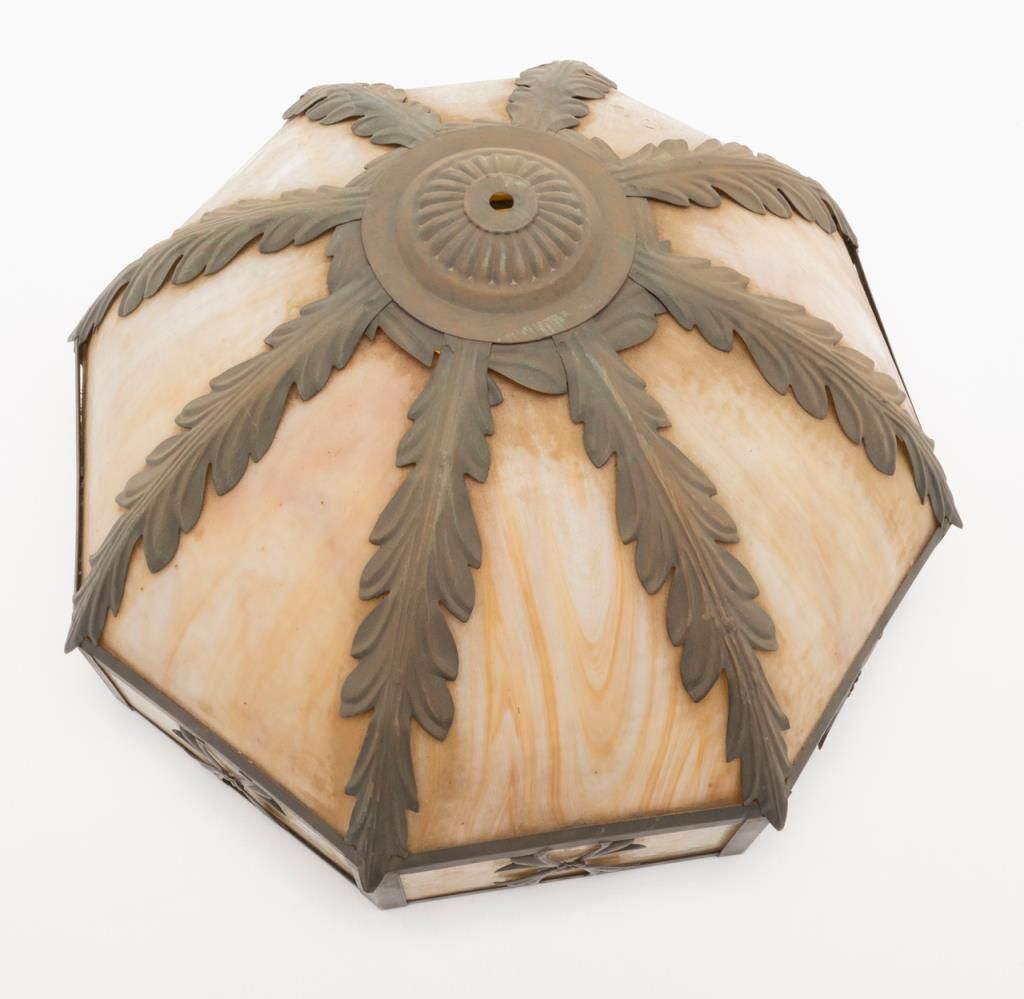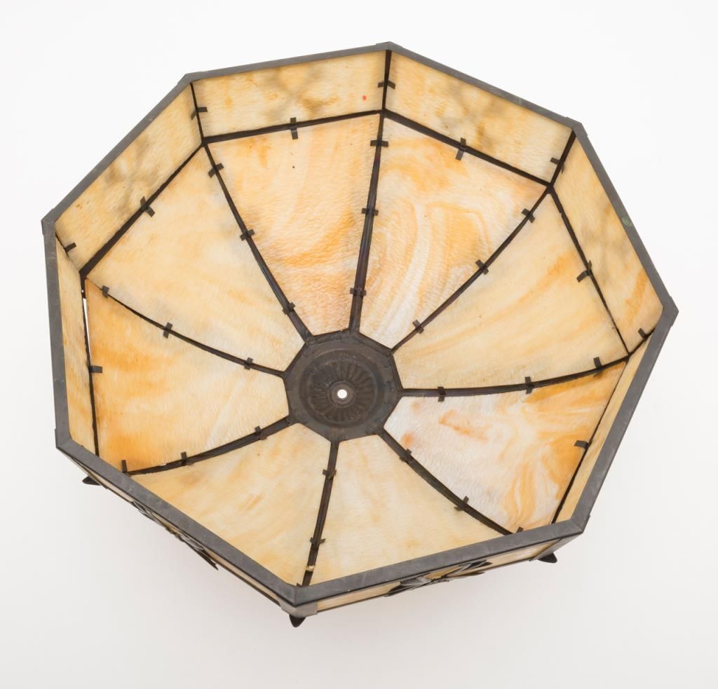 Large Bradley & Hubbard type octagonal stained glass lamp shade in very good condition; beautiful vanilla and brown colors in the glass; approx. 19” in diameter and 9” in height; possibly a real “sleeper”; from an old Southern California estate. Est.: $150-$300.