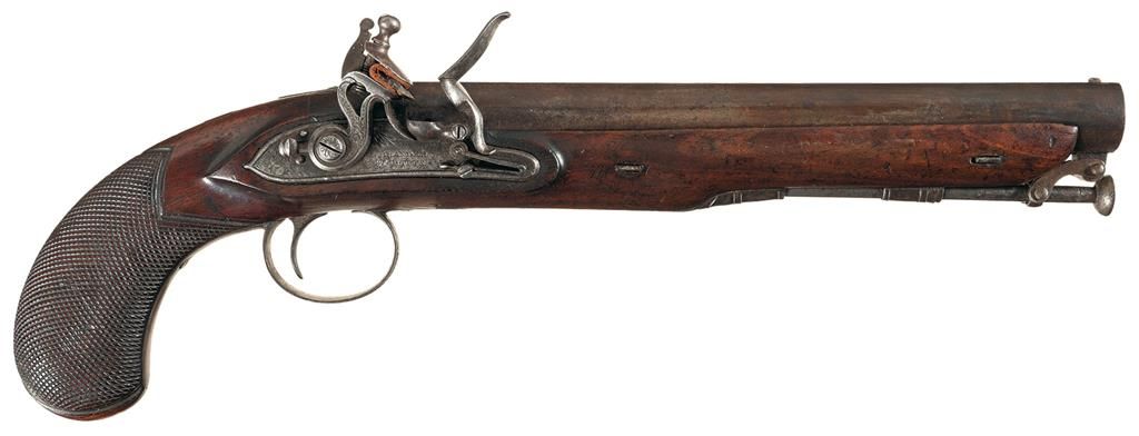 The cocking piece and lock plate feature a floral engraving and the lock plate is marked "BRANDER/& POTTS" ahead of the cocking piece. The top of the barrel is flat and is marked "70 MINORIES, LONDON." Fixed sight, sliding hammer safety, engraved barrel tang and trigger guard, swivel iron ramrod with button head and pineapple trigger guard finial. The full length stock has checkering on the grip area and a small silver oval thumb escutcheon. The firm of Brander & Potts was active in the early 19th Century, with Mr. Brander being called upon to testify in the high treason trial of James Watson following the events of the Spa Fields Riot, where an anti-monarchy mob sacked several gunsmiths in the Minories area before an abortive attack on the Tower of London.