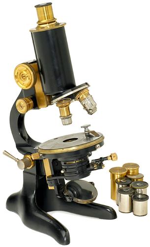 Großes Messing-Mikroskop, um 1920 Deutsches Arbeitsmikroskop, unbezeichnet, vermutlich "Zeiss", Höhe 32 cm, schwarz lackiert, 4-fach-Revolver mit 3 Objektiven, mit Kasten.