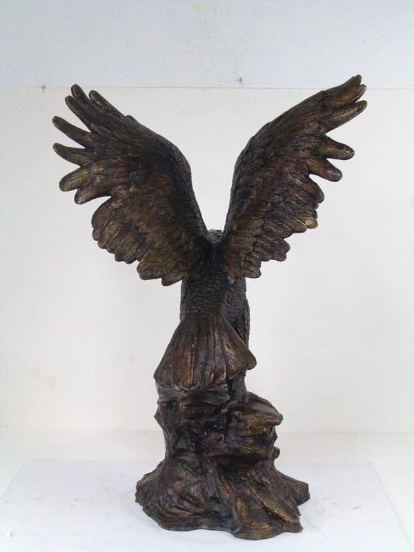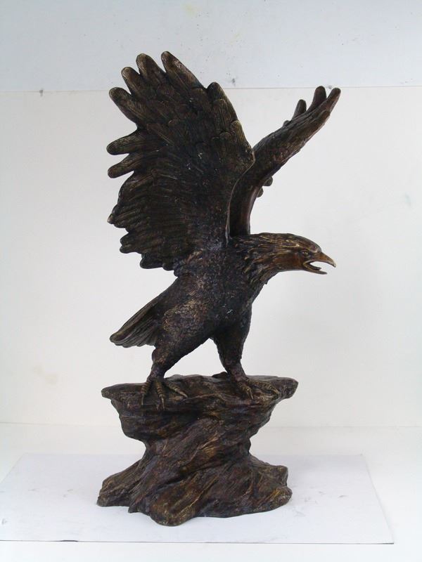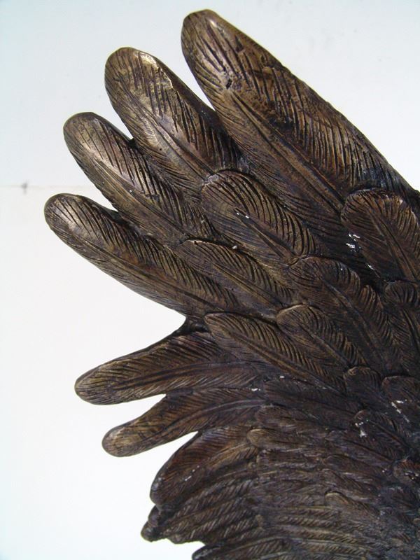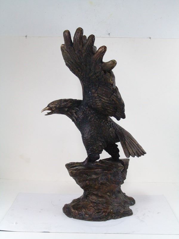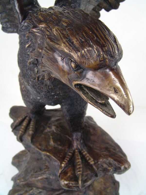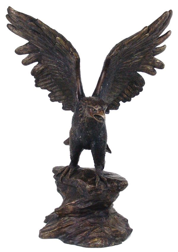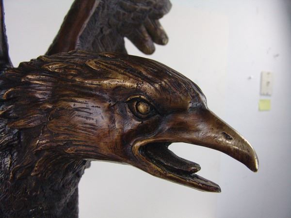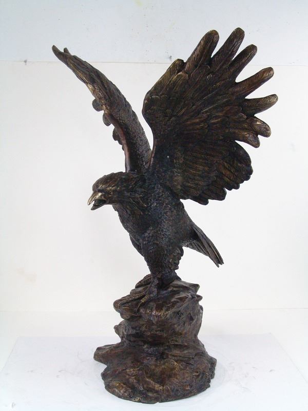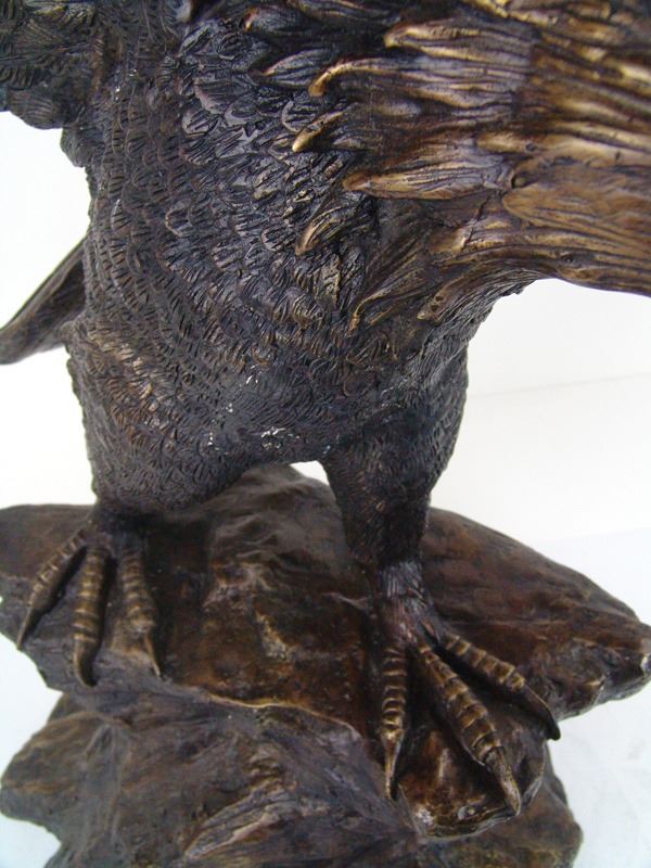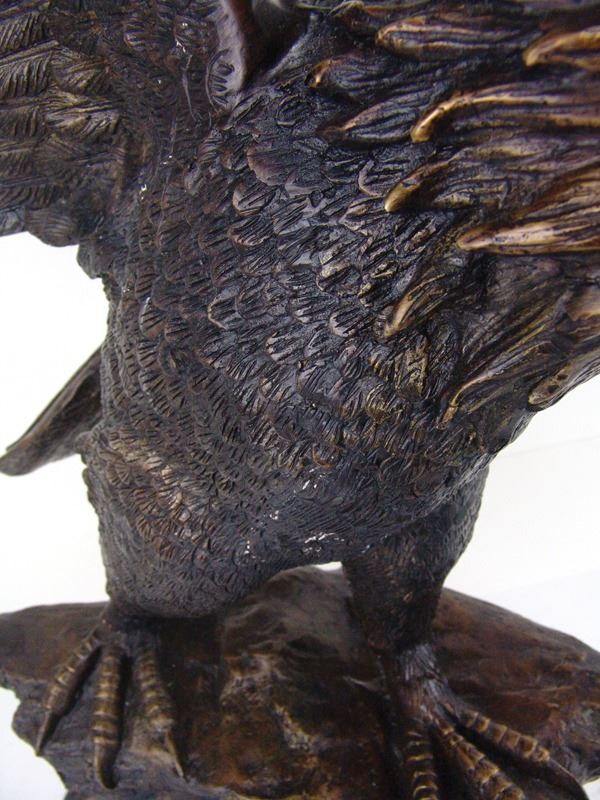 Large and impressive alighting eagle sculpture out of cast bronze with highlights on the head and talons. Very good condition, good detail.Late 1900s39" x 39" x 22"