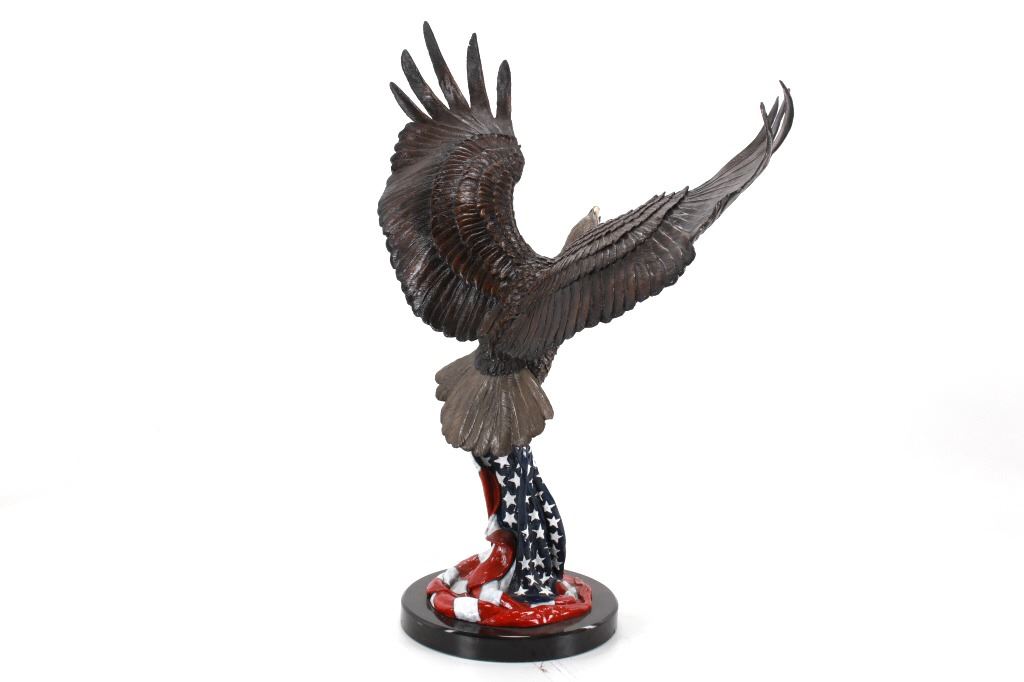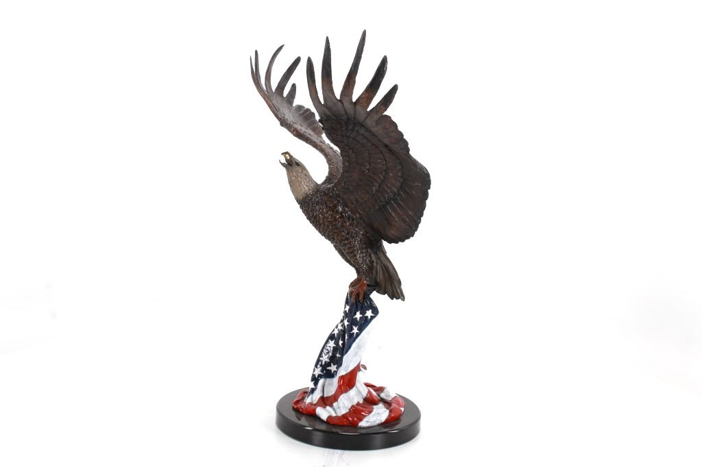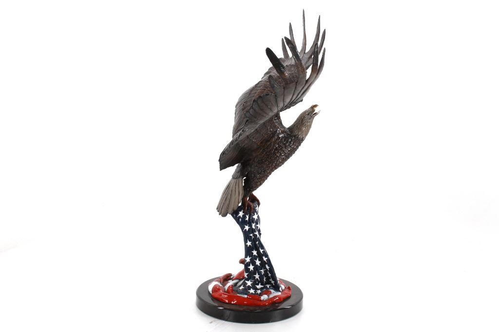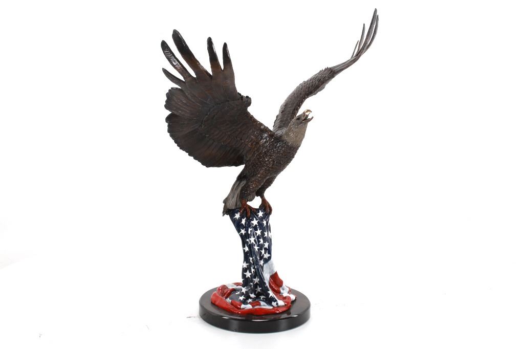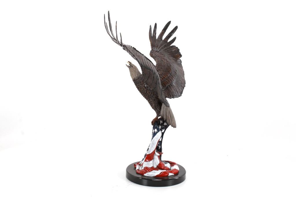 Featured in this lot is a bronze sculpture called "Eagle's Freedom Flight," by artist Duane Scott. The bronze sculpture features a wonderfully and professionally crafted bronze construction that features a patinated eagle with a painted American flag roost. The eagle shows its wingspan fantastically while taking off from a painted American Flag roost and is mounted on a polished granite base. The bronze is marked 'D. Scott' and is numbered 60/299. Duane Scott is an artist whose work has been offered at auction many times always commanding high prices and collectability. Others in this exact form have brought upwards of $15,000. The condition of this large bronze is good with no obvious signs of damage and shows good overall condition. The measurement of this large bronze is 49" x 40 1/2" x 17".*
