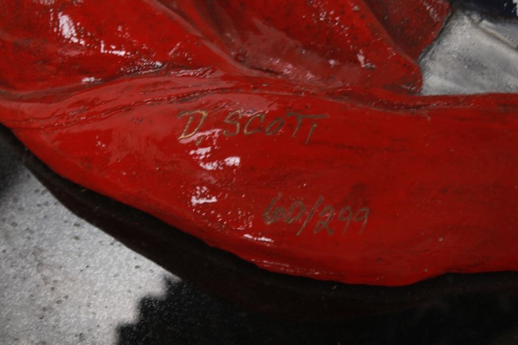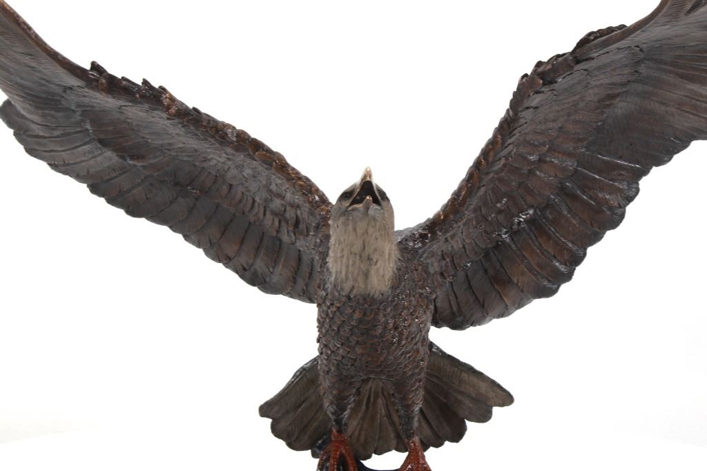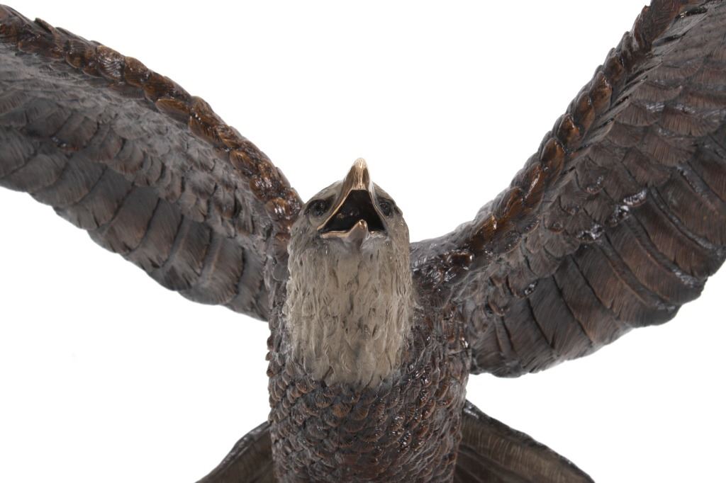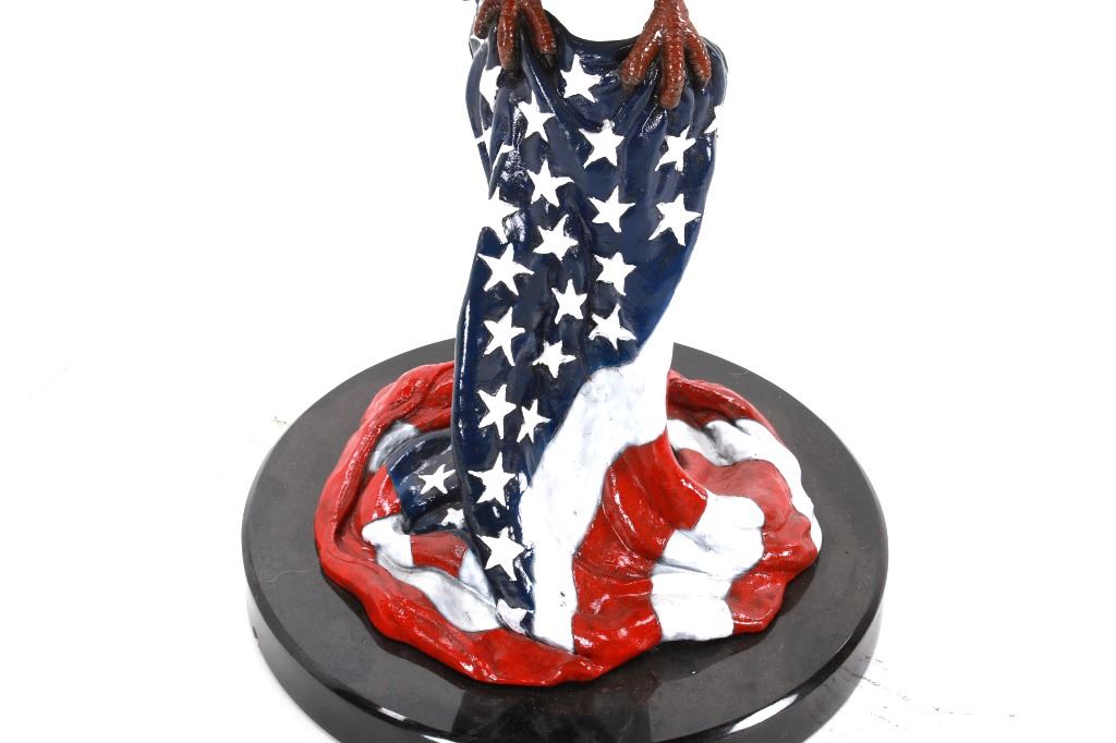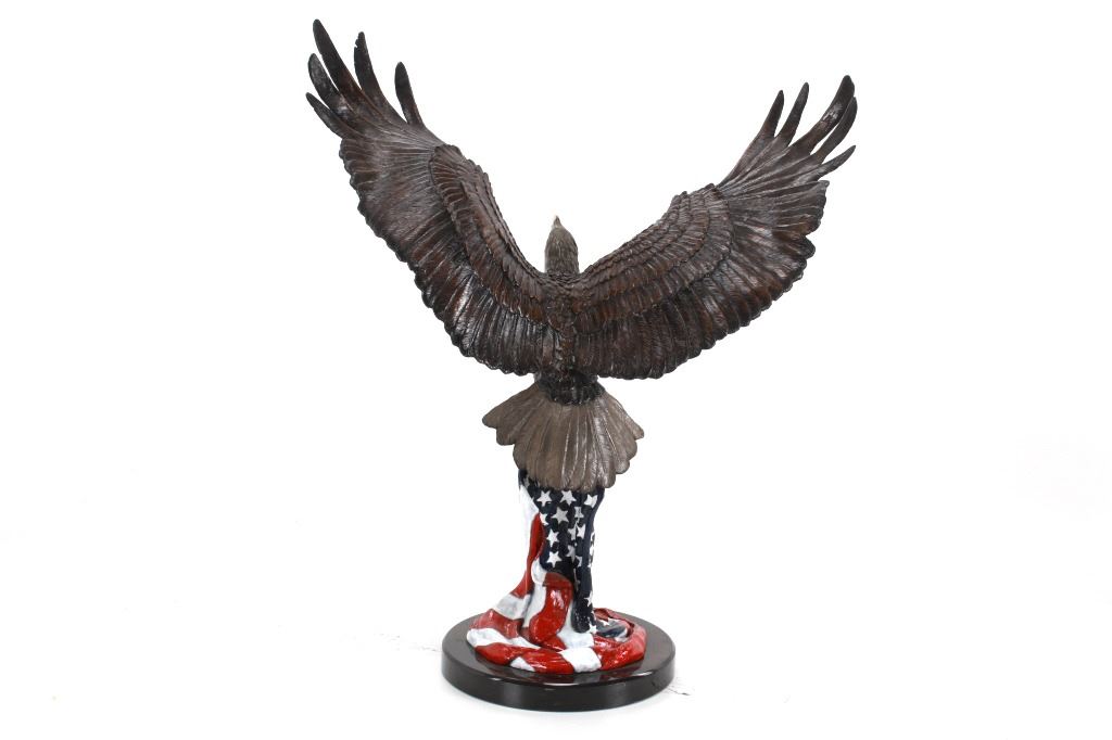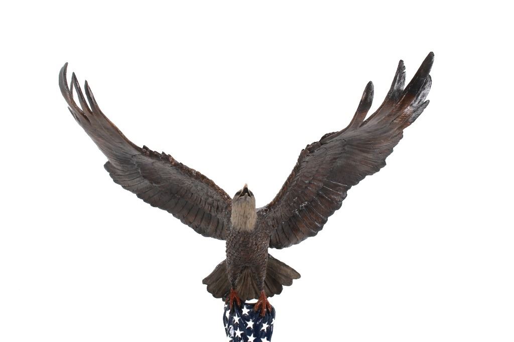 Featured in this lot is a bronze sculpture called "Eagle's Freedom Flight," by artist Duane Scott. The bronze sculpture features a wonderfully and professionally crafted bronze construction that features a patinated eagle with a painted American flag roost. The eagle shows its wingspan fantastically while taking off from a painted American Flag roost and is mounted on a polished granite base. The bronze is marked 'D. Scott' and is numbered 60/299. Duane Scott is an artist whose work has been offered at auction many times always commanding high prices and collectability. Others in this exact form have brought upwards of $15,000. The condition of this large bronze is good with no obvious signs of damage and shows good overall condition. The measurement of this large bronze is 49" x 40 1/2" x 17".*