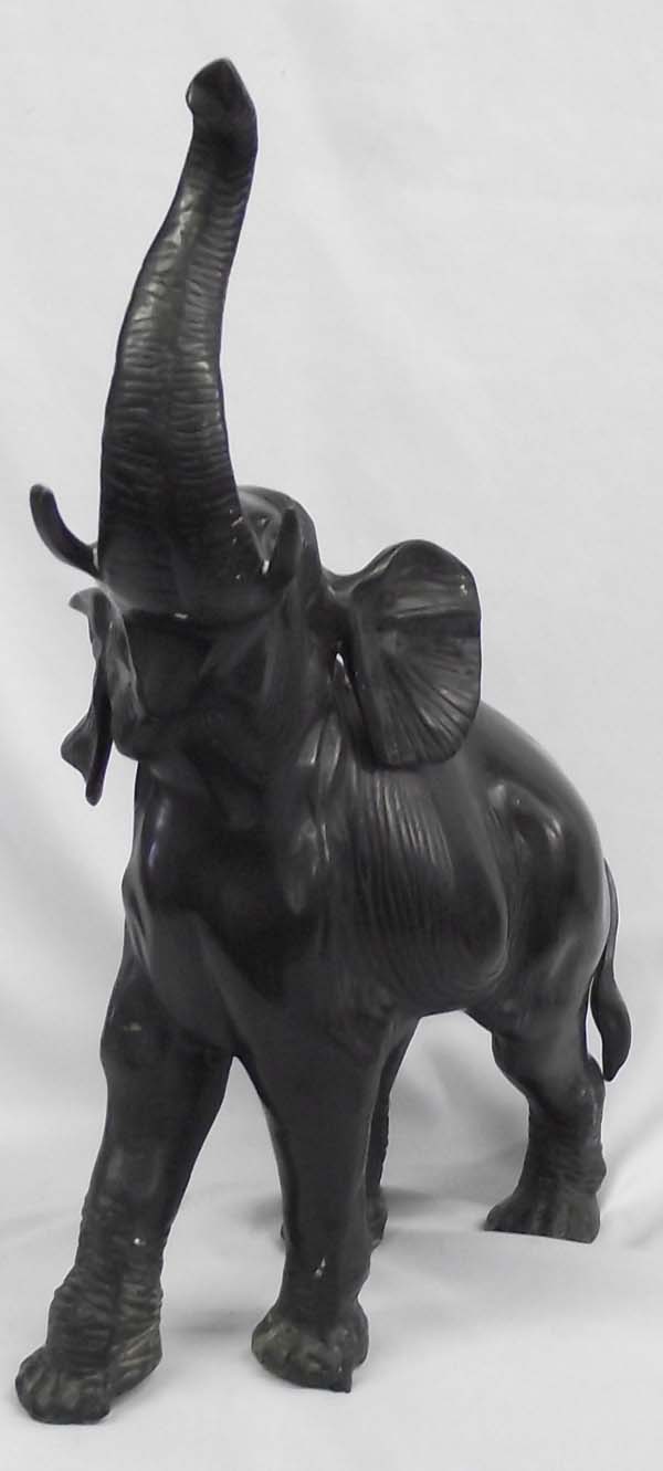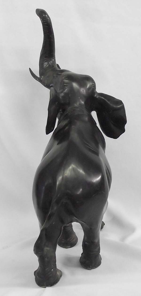 Large Bronze Elephant Sculpture. Measures approx. 23''H (bottom of foot to top of raised trunk) x 20'' long. Origin unknown, no markings. Buyers Pay Actual Shipping and Handling Charges(see terms and conditions for more information).