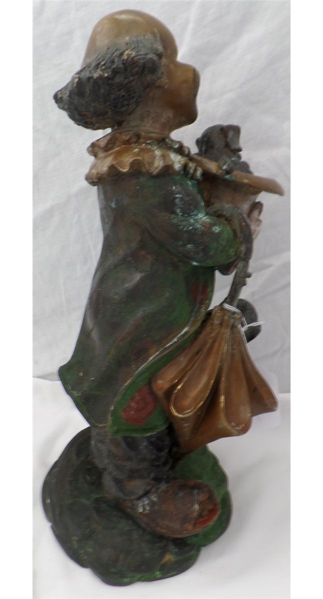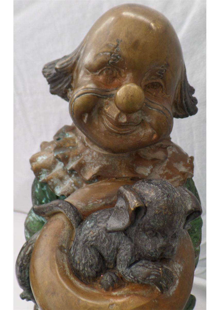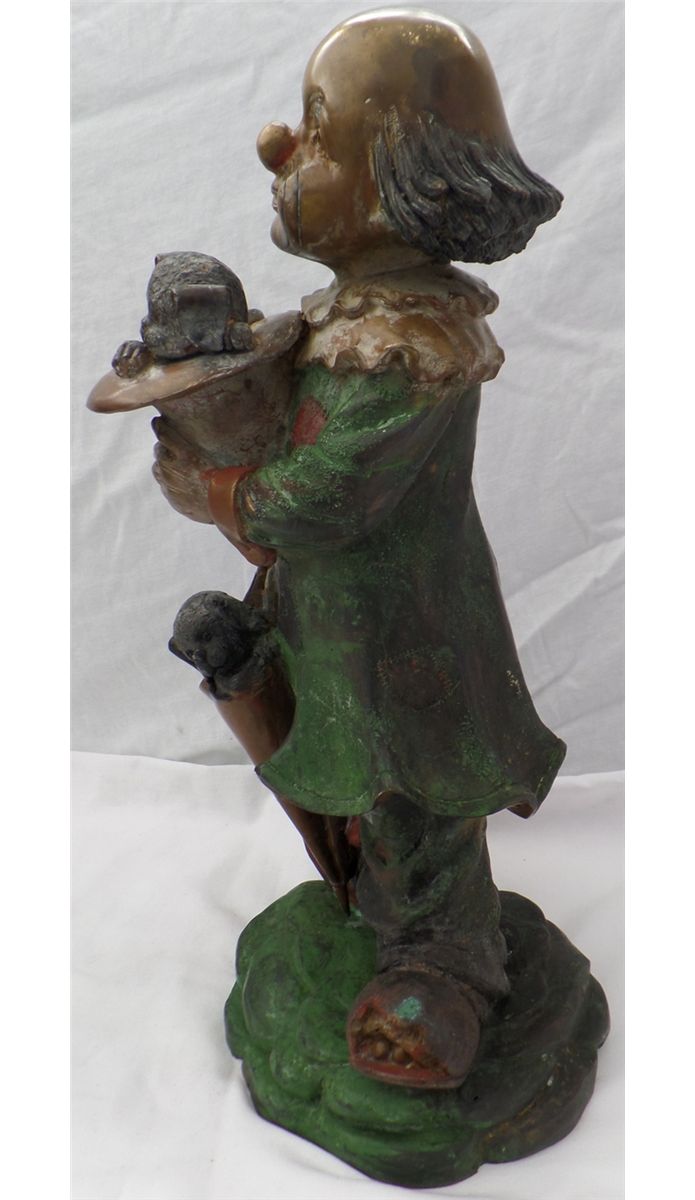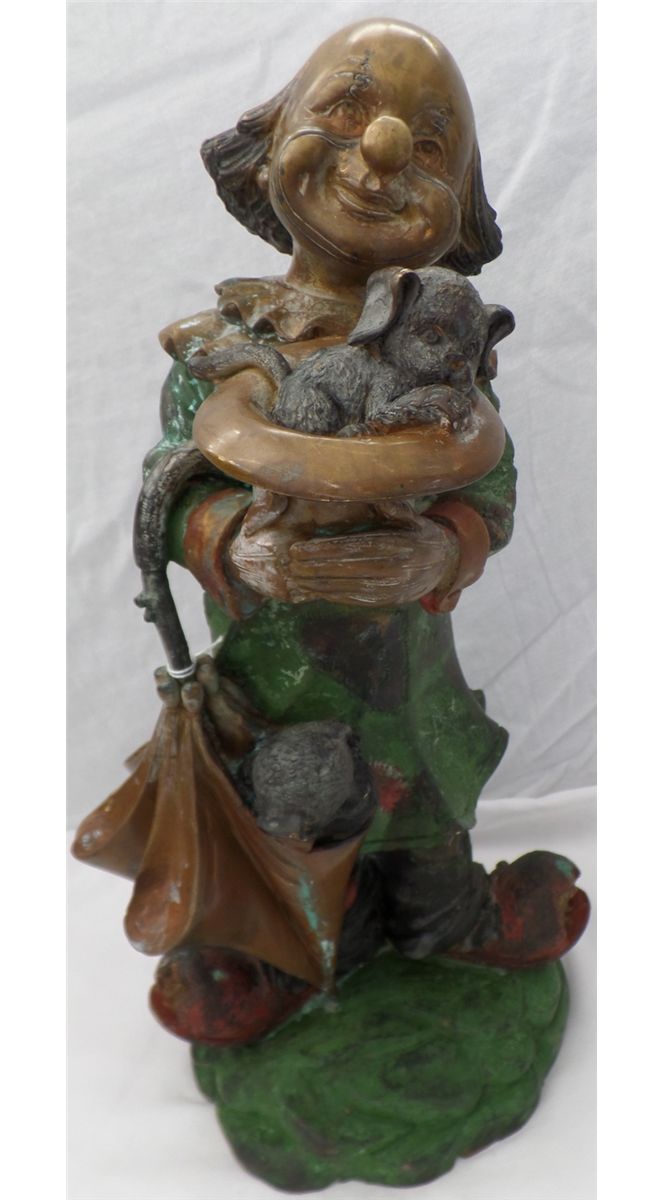 Large Bronze Figure of Clown with 2 Puppies. Item measures 18" x 8.5" x 7.25" and weighs 21 lbs. Painted Bronze. Condition: Some paint loss. Shipping: $24.