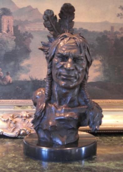 Native American Chief Bust, Bronze Sculpture, After Bzach, 18" H x 11"W x 9"D 25 lbs This bronze sculpture was produced using the "Lost Wax" casting method. The"Lost Wax" Cast method is the most precise metal casting technique in existence, ensuring exquisite detail of the original host model which is usually sculpted in clay or wax. This "Lost Wax" casting method is an extremely labor intensive and expensive process, but the end results produce a Heirloom Quality Masterpiece!