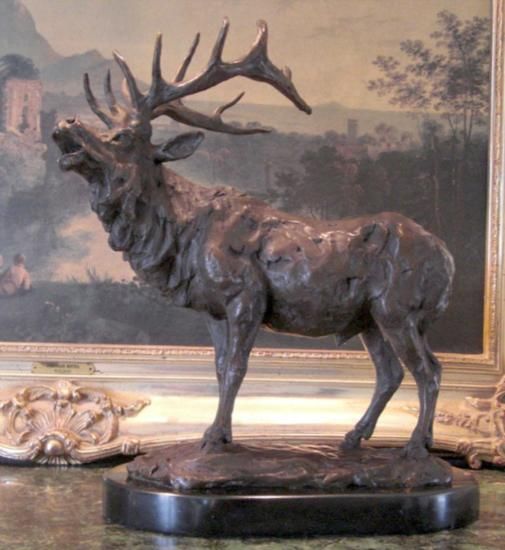 Standing Elk Bronze Sculpture, After Barye, 17"L x 7"W x17"H26 lbs. This bronze sculpture was produced using the "Lost Wax" casting method. The"Lost Wax" Cast method is the most precise metal casting technique in existence, ensuring exquisite detail of the original host model which is usually sculpted in clay or wax. This "Lost Wax" casting method is an extremely labor intensive and expensive process, but the end results produce a Heirloom Quality Masterpiece! Antoine-louis Barye (1796 - 1875) Originally trained as a goldsmith, Antoine-Louis Barye served in Napoleon's army before studying sculpture and painting. He entered the Ecole des Beaux-Arts in 1818 and adapted the romantic-style subject matter of violent and majestic animals. After his crocodile-like sculpture entitled Tiger Devouring a Gavail, won a medal at the Salon of 1831, Barye became a successful and independent sculptor and painter. His animal sculptures competed at the Salon alongside the more traditional and revered human figures. In 1845, Barye began a foundry that produced smaller and more affordable bronze statues. He was appointed the keeper of plaster casts at the Louvre and professor of zoological drawing at the Musee National d'Histoire Naturelle, both in Paris. Elected to the Academie in 1868, Barye inspired a later generation of animal sculptors who called themselves the animaliers.