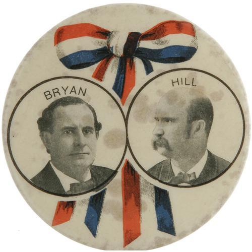 <B>Large Bryan and Hill Jugate 1900 Celluloid Campaign Button,</B></I> 2 1/8", with photos of William Jennings Bryan and David Bennett Hill over a red, white and blue ribbon on a white background, Whitehead & Hoag Co.. Some foxing, otherwise, in excellent condition.<BR><BR><b>Shipping:</b> Miscellaneous Collectibles, Smal (<a target="_blank" href="http://www.heritageauctions.com/common/shipping.php">view shipping information</a>)