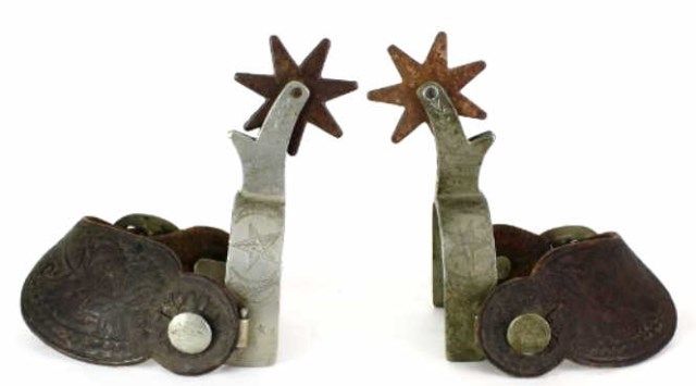 with 1 1/8" heel bands, star and moon engraving, 2 1/2" chap guard shanks, large 2 1/2" rowels. Great old 2 piece leather straps. Est. 200-400