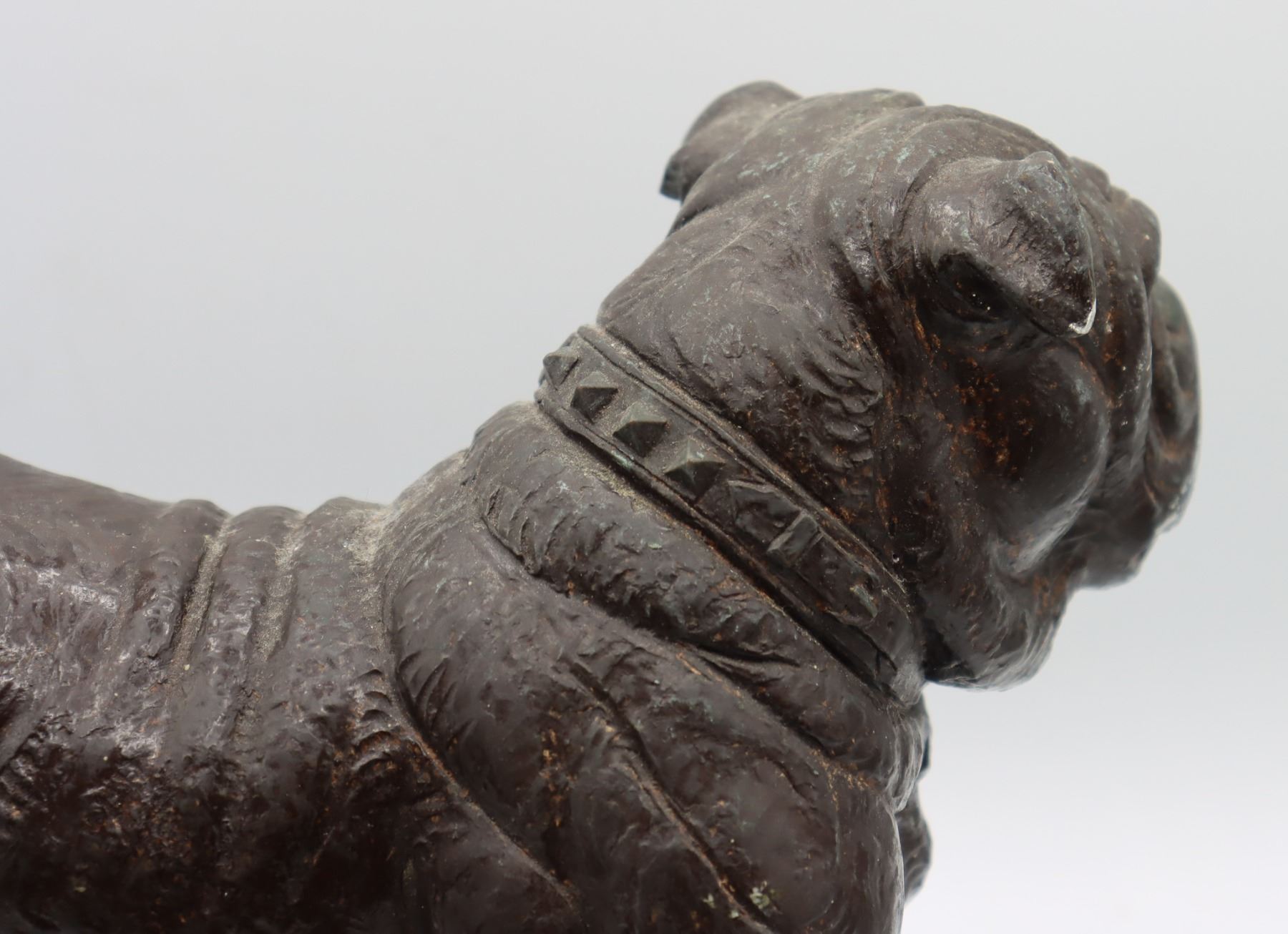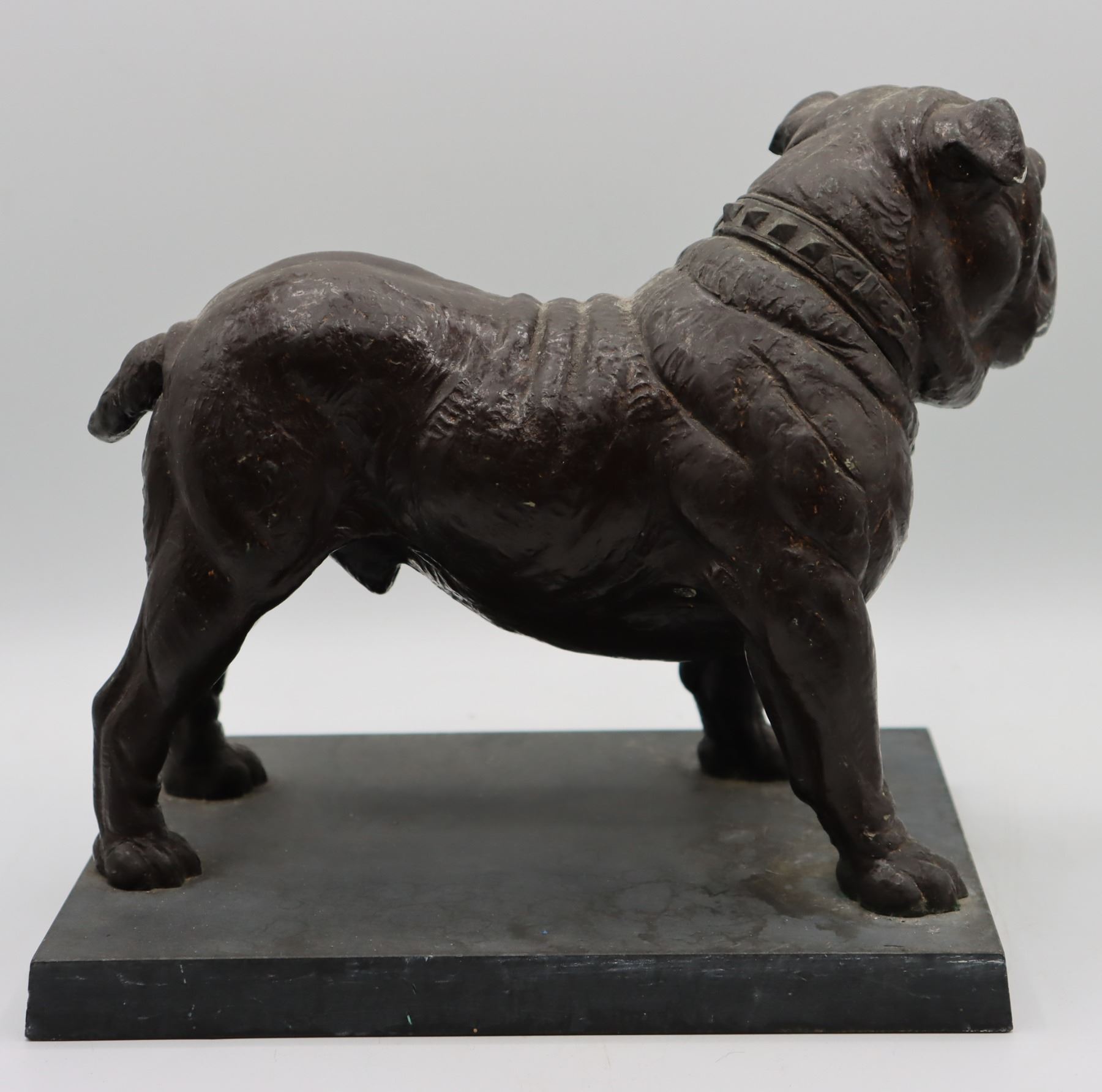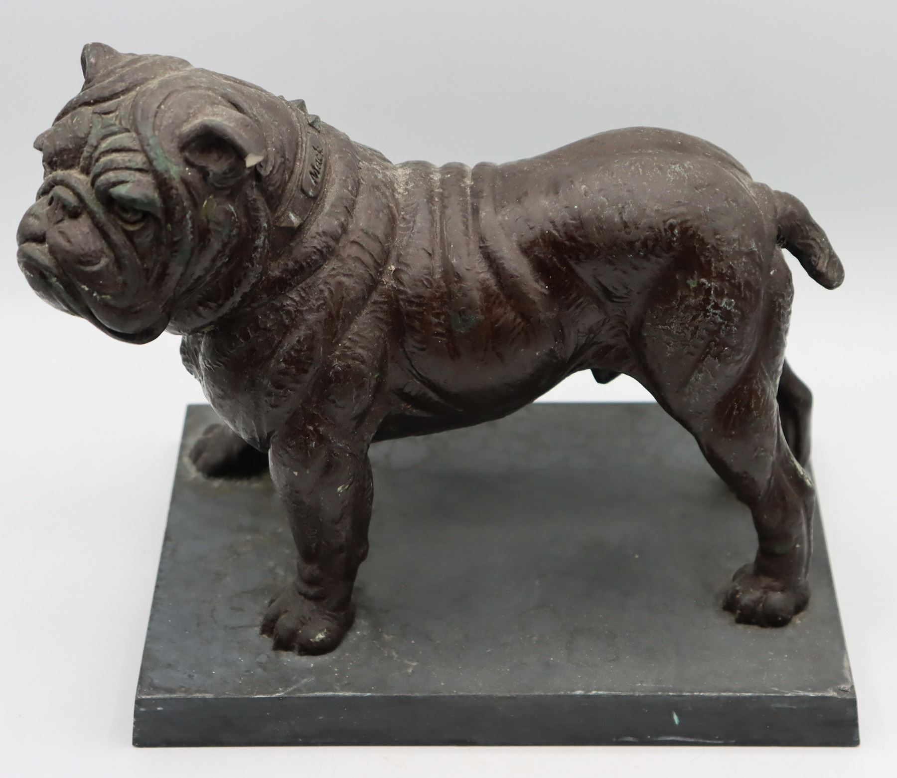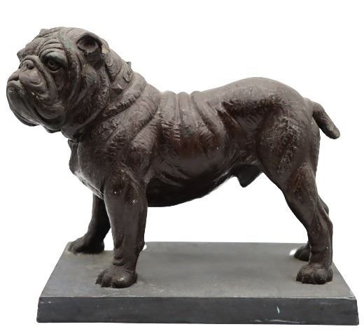 A regal male bulldog wearing a collar in a strong stance, appears to be of painted metal including base.