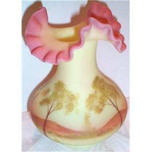 This Fantastic Hand Painted Fenton Burmese Ruffled Edge Vase is in SUPERIOR condition with no chips, cracks, or dings and it is Artist Signed by K. Haught. The Vase is hand painted with a lovely pastoral scene and it measures 6" in diameter and stands a stately 7" tall. It is signed on the bottom by the artist K. Haught.