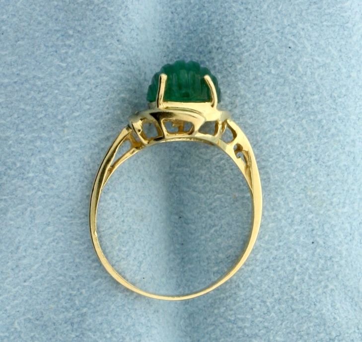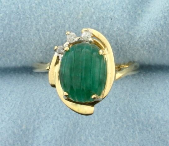 In 14k yellow gold. Contains a large cabochon cut 10x8mm natural Emerald with beautiful deep green color and unique grooves cut on surface. Also contains three high quality diamonds ranging from .01 to .02 cts each. Size 7. 3.0g.