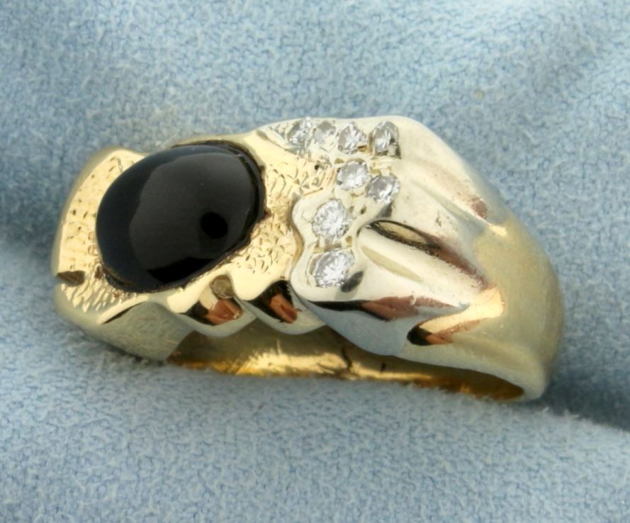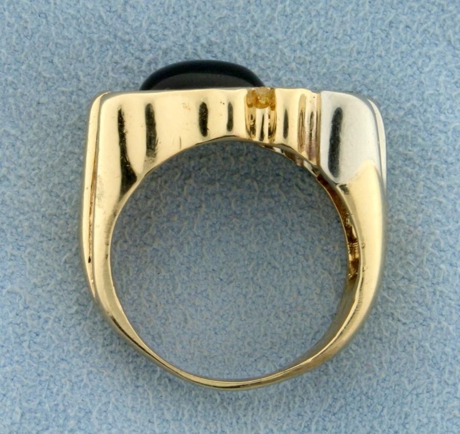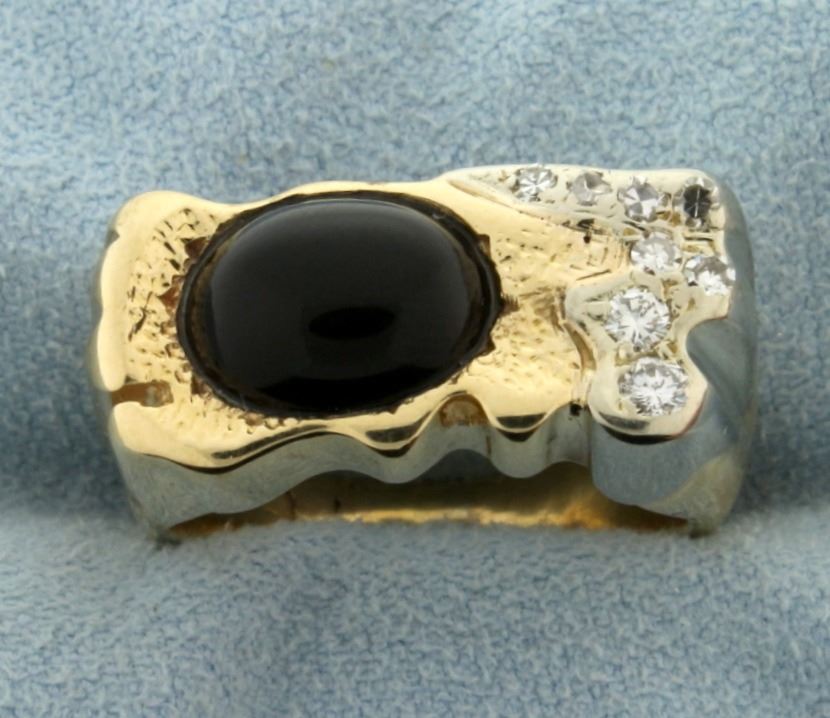 In 14k yellow and white gold, containing a 10x7mm oval cabochon Onyx gemstone. Also contains .15 ct TW of very high quality diamonds ranging from .04 to .01 cts each. Diamonds are VS clarity/F color. Size 7 3/4. 9.5g.